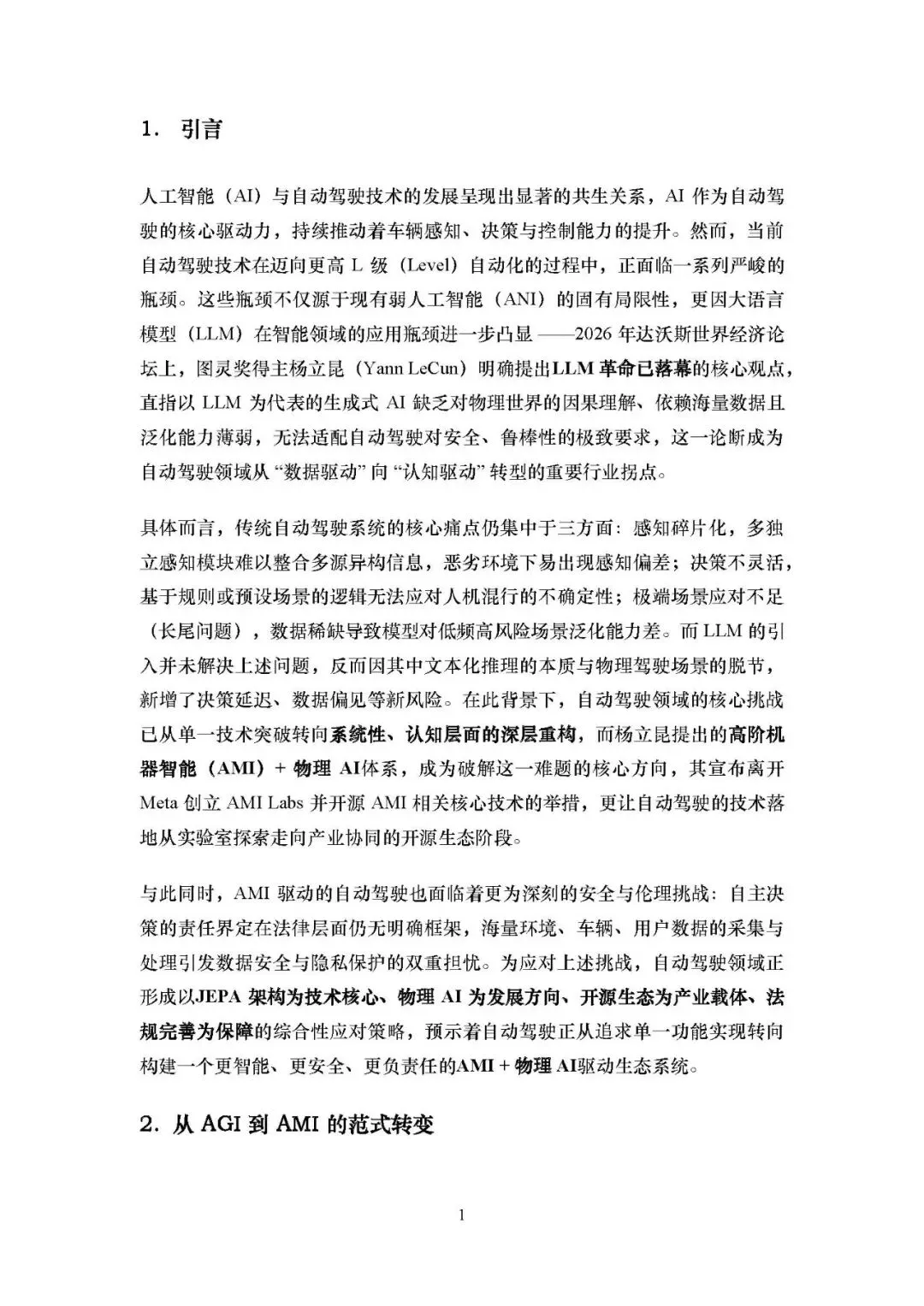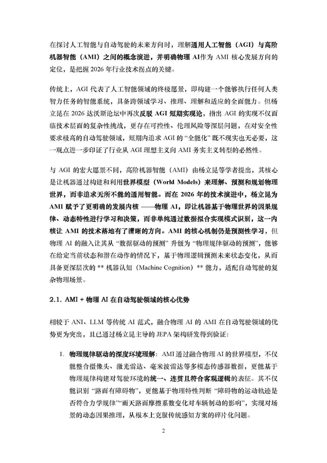 这份文档以 2026 年达沃斯论坛图灵奖得主杨立昆的观点为核心,指出自动驾驶领域正迎来从AGI(通用人工智能) 向AMI(高阶机器智能)+ 物理 AI的范式转变,剖析了当前自动驾驶的技术瓶颈,阐述了 AMI + 物理 AI 的技术优势、面临的挑战,并构建了其驱动自动驾驶发展的生态体系,同时规划了 2026-2040 年的发展路线,揭示了该技术对出行生态乃至社会的深远影响。核心内容总结如下。