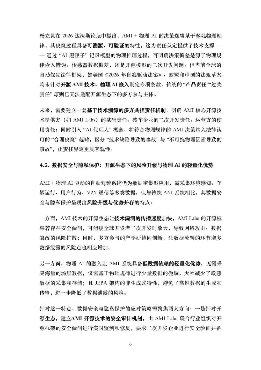 随着 AMI + 物理 AI 融入自动驾驶并进入开源生态,新的挑战应运而生:一是自主决策的责任界定因参与主体多元化变得复杂,现有法律框架无法适配;二是开源生态加快技术漏洞传播、增加数据流转环节,带来数据安全与隐私保护风险,不过物理 AI 的轻量化特性也为风险缓解提供了可能;三是开源技术的二次开发边界模糊,易引发知识产权纠纷,且差异化开发可能导致技术标准不统一,阻碍产业协同。