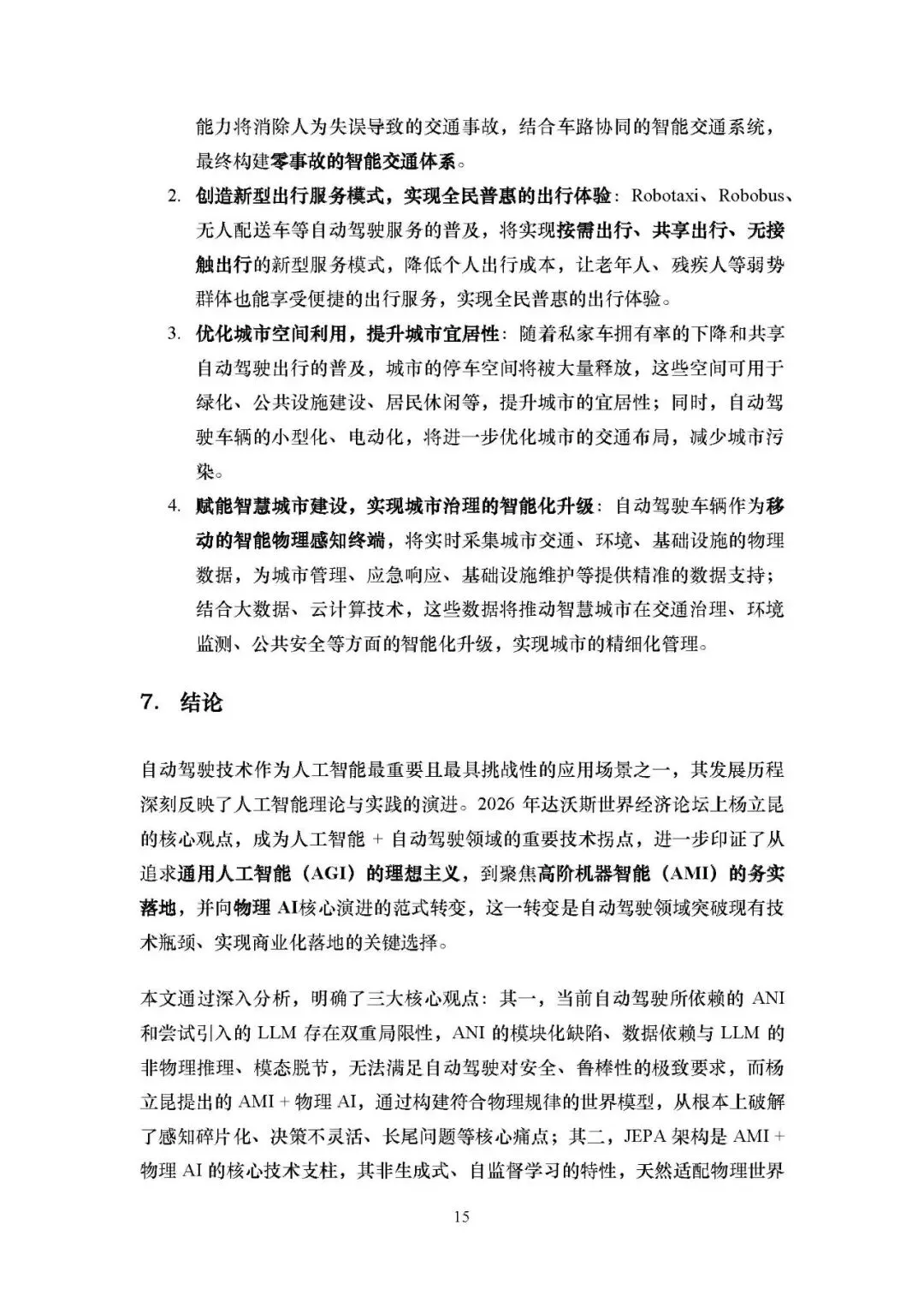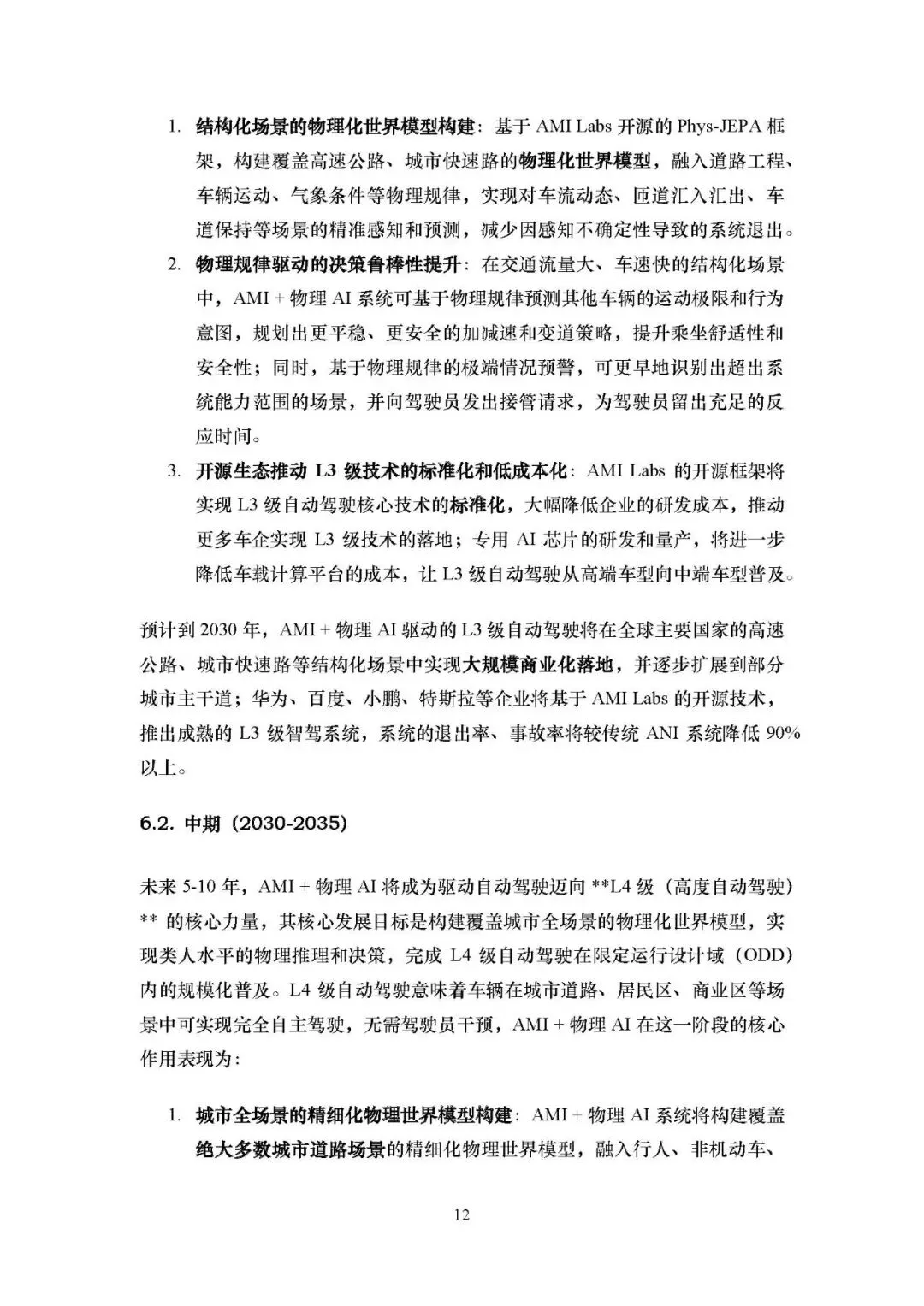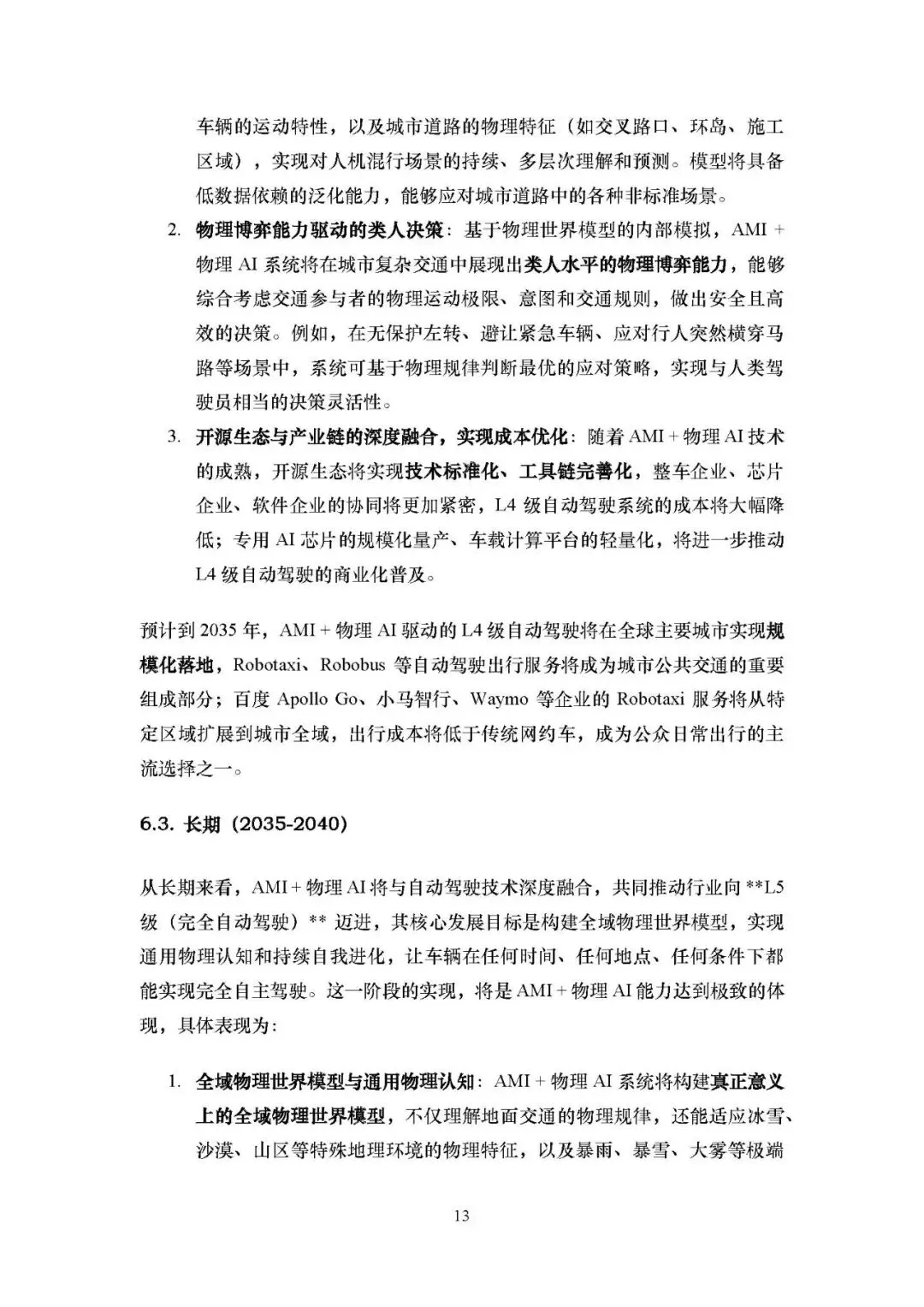 中期(2030-2035):构建城市全场景精细化物理世界模型,实现类人水平物理博弈决策,推动 L4 级自动驾驶在城市限定域规模化落地,Robotaxi 等出行服务成为城市公共交通重要组成部分。