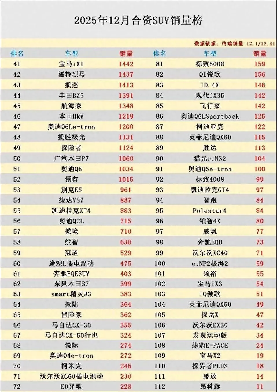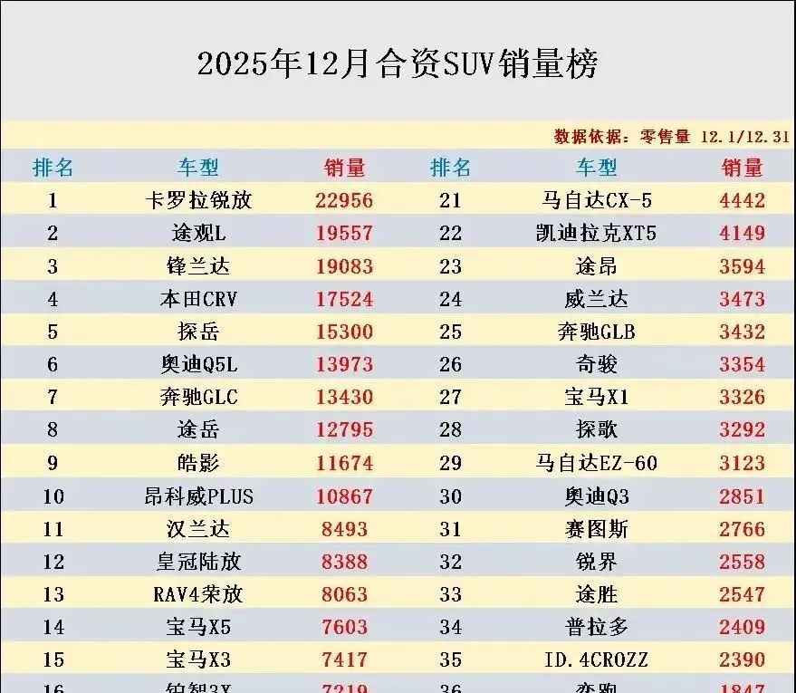 年底的合资SUV市场彻底变天了!12月销量榜一出炉就让人意外,以前稳坐前排的途观L直接跌出视线,反倒是卡罗拉家族的锐放异军突起,单月卖出2.2万辆,把锋兰达、皓影这些同级合资对手远远甩在身后。更让人没想到的是,豪华品牌也撑不住了——奥迪那台长轴中型SUV(Q5L)只卖了13973辆,勉强守住第六名;别克昂科威Plus更惨,直接跌到第十,销量破万都得靠疯狂促销硬堆。