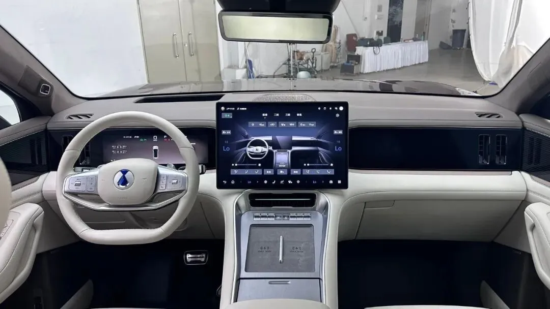 进车之后我第一件..就是摸材.料。大家知道我这个人,对内饰用料特别..感,之前D9那期我就吐槽过它的木纹装饰太假,这次N8L明显改了,皮质包裹的面积大了很.,中控那块有点类似Alcantara的绒面材质,摸上去那种“吸手”的感觉。方向盘那种粗.细握感我觉得.刚好,而且三辐.造型做得很到位,不打.手。然后中控那块屏,我拿.指甲敲了一.下,咔咔响但还可以接受,不是那种.塑料毛.坯感。车机这次搭载的是腾势OS新系统,流畅度明显.上来.了,反应比D9快.很多。
