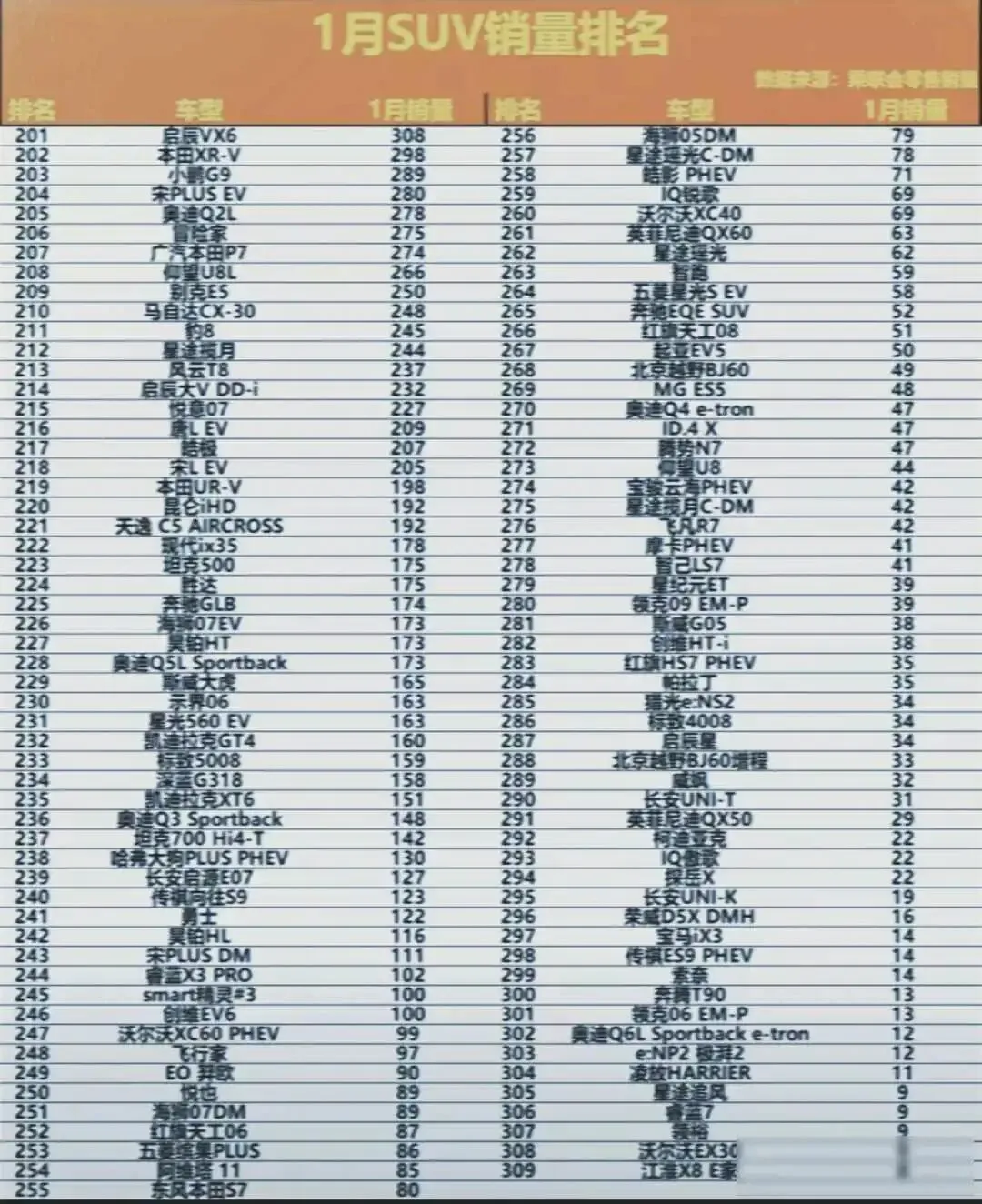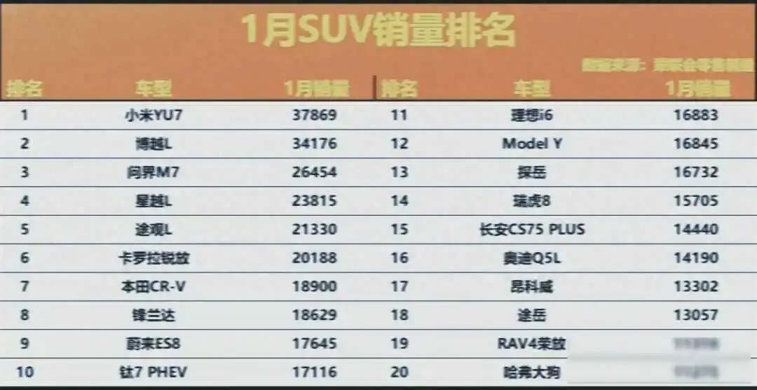 2026年1月,SUV销量榜前几名的车全是新能源车,小米YU7一个月卖了近4万辆,排在第一位,博越L和问界M7分别卖了3.4万和2.6万辆,也进了前三名,这些车不是靠老套路卖出去的,而是用智能座舱、快充、城市NOA这些新功能吸引用户,从数据来看,问界M7、M5、理想L6、零跑C10这几款车的销量在2万辆到5000辆之间稳稳占住位置,说明它们已经不光是让人尝鲜的产品,而是真能当成家用车来用。