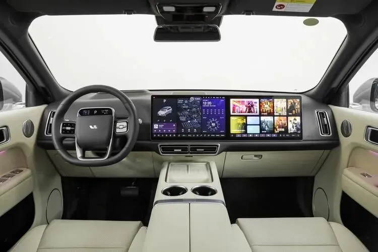 内.饰方面.,该车配备三块15.7英寸3K OLE.D大屏,方向盘液晶仪表和47英寸.AR-HUD一应俱全。它的车机内置高通骁龙8155芯.片,系统运行起来十分.流畅。