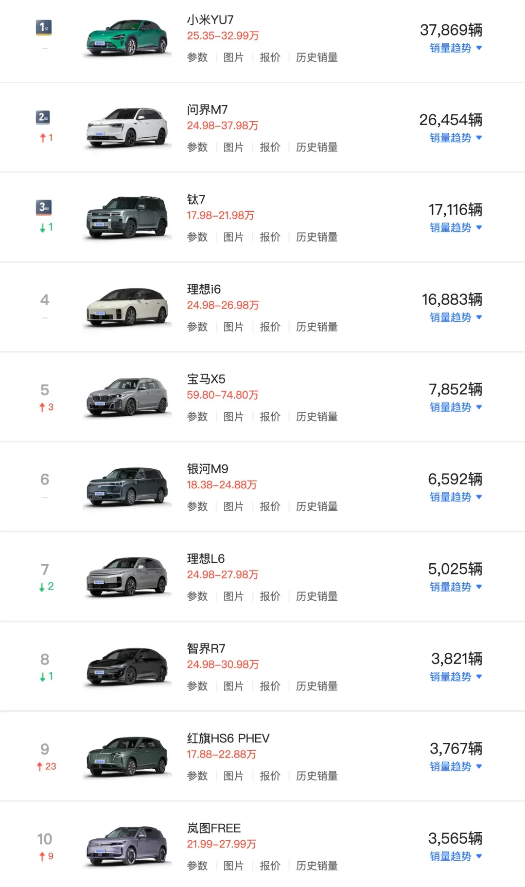 银河M9的主要竞品是小米YU7、问界M7,在上述两款车型表现稳定的情况下,银河M9多多少少受到了影响,1月车市整体低迷,M9环比下滑约38%至6592辆,但仍进入中大型SUV销量前十,表现优于多数同级燃油与新能源车型。