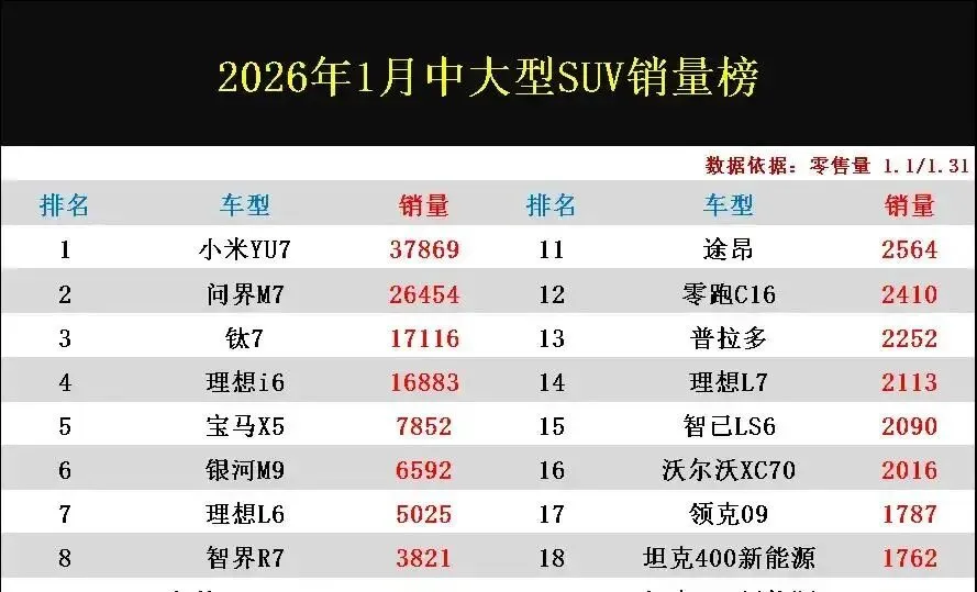 宝马X5销量垫底?2026年1月SUV销量榜炸出个天坑——唯一上榜的燃油车,竟成了全场倒数第二!