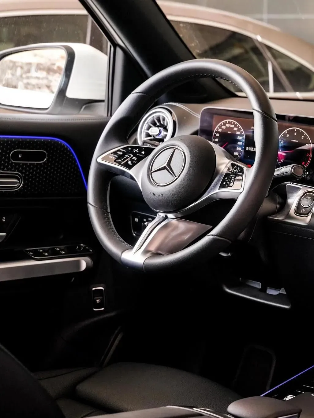 进入车内.我一坐就能.感觉到,GLB这个内饰明显更年.轻。双联屏、涡.轮空调口、氛围灯.全都有,一.晚上看是.真的炫。方向盘是新款平底.造型,手感还行,就是皮.有那么一点滑,要是.打弯多了手出汗会打滑。