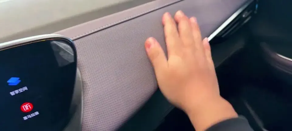 内饰用料属于“看着挺高级,摸起来也不差,但别幻想全软”。比如:中控上方是塘塑材质,质感略微偏硬;但同时,这里以及这里都是皮质的软包,整体观感是OK的。