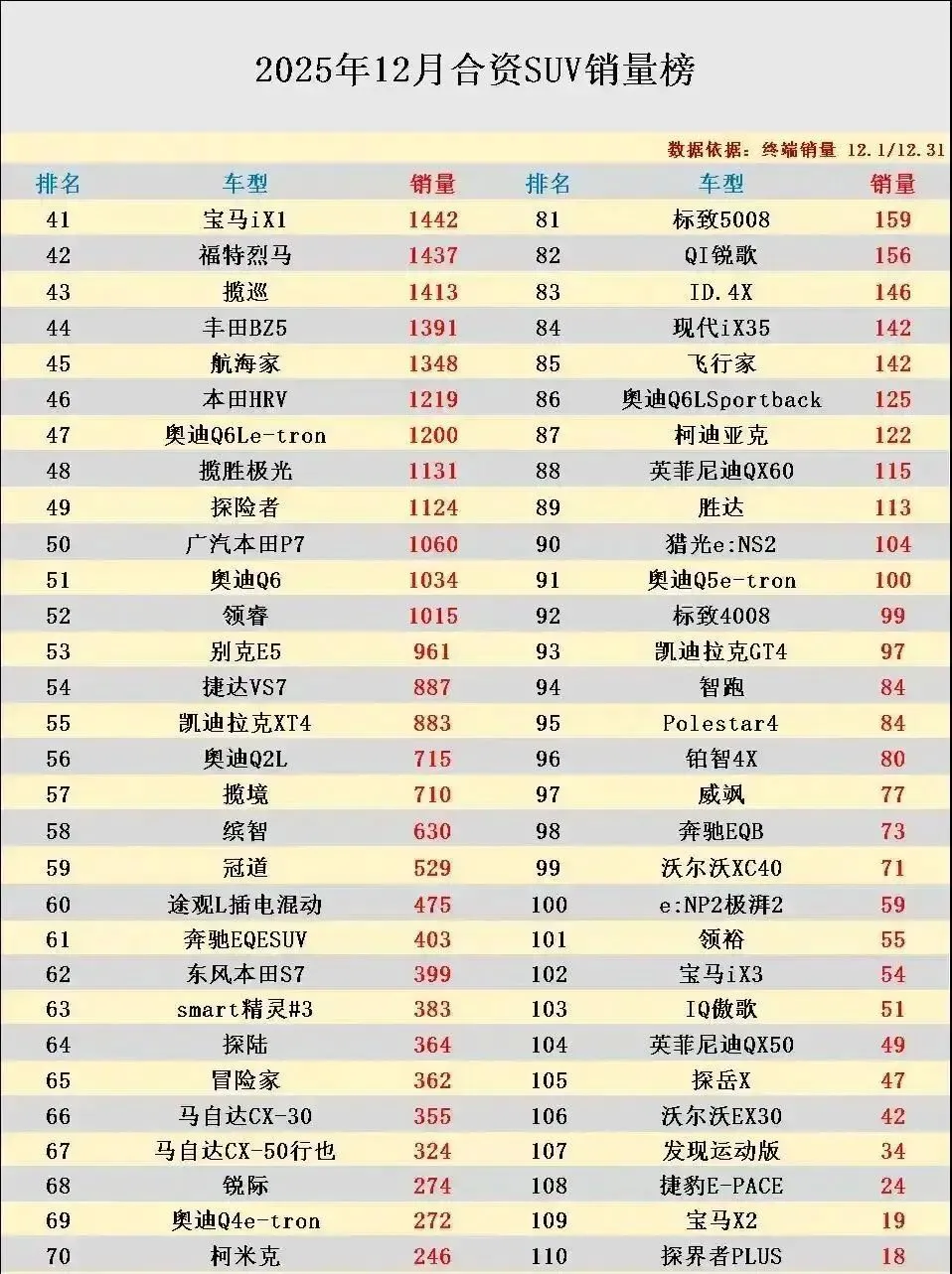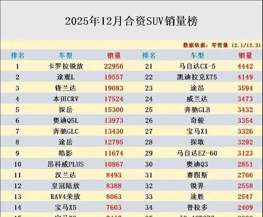 十二月销量榜一出来,我直接把手机摔在桌上——卡罗拉锐放干到2.2万辆,奥迪长轴中型SUV才1.3973万,排名第六。合资车集体趴窝,别克昂科威破万还得靠促销堆,连锋兰达、皓影都只能在后面排队等饭。