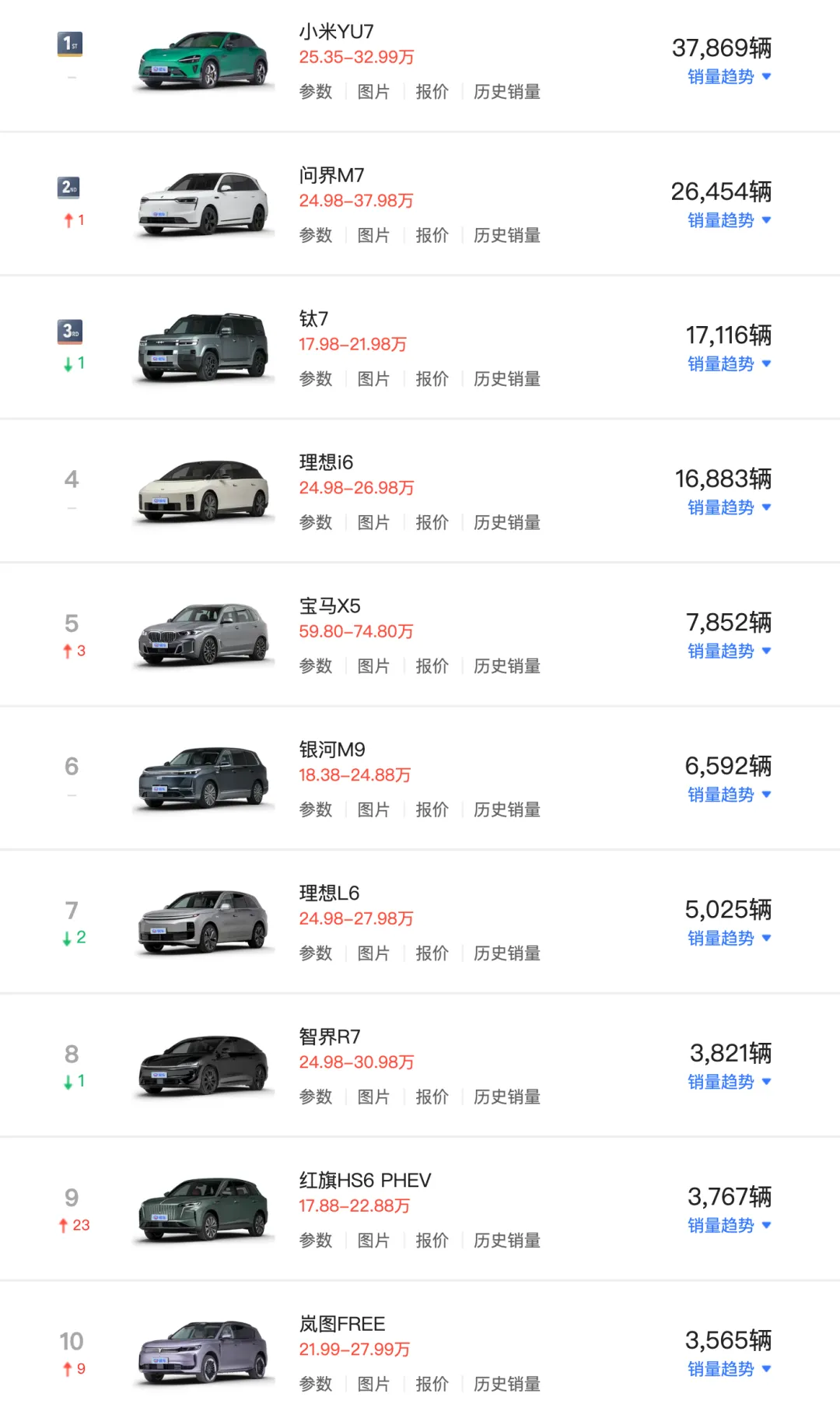 更诡异的是前三名全是“7字头”:小米YU7、问界M7、钛7。三个名字像约好了来砸场子,后面车型从第4名开始就明显掉档,榜单被硬生生切成了“前三一档、其余一档”。