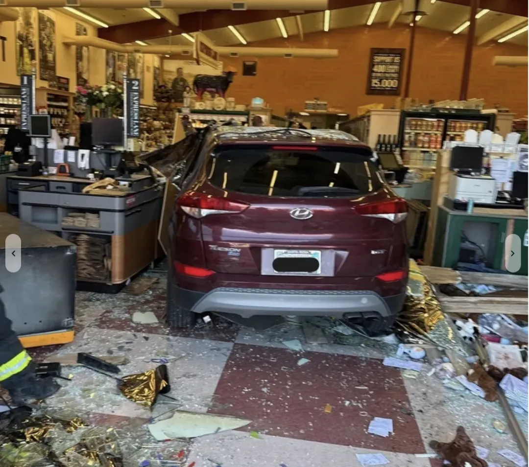 这辆红色的现代(Hyundai)SUV并没有在门口停下,而是裹挟着破碎的玻璃门框和金属碎片,完全冲进了店内,最终停在了收银台区域。现场照片显示,车辆周围满是散落的糖果架、被撞歪的收银机以及压扁的食品杂货。