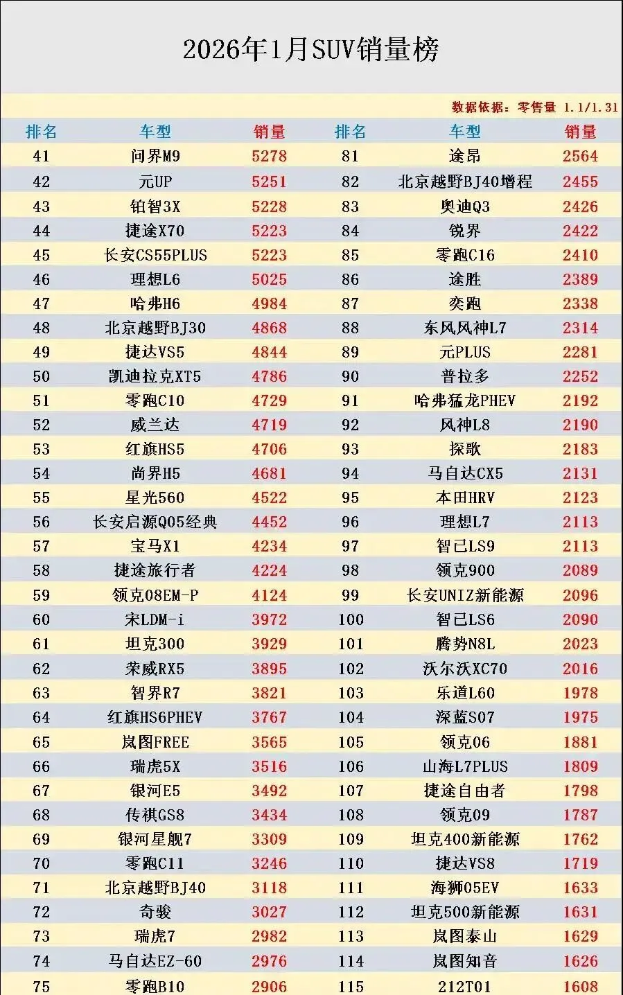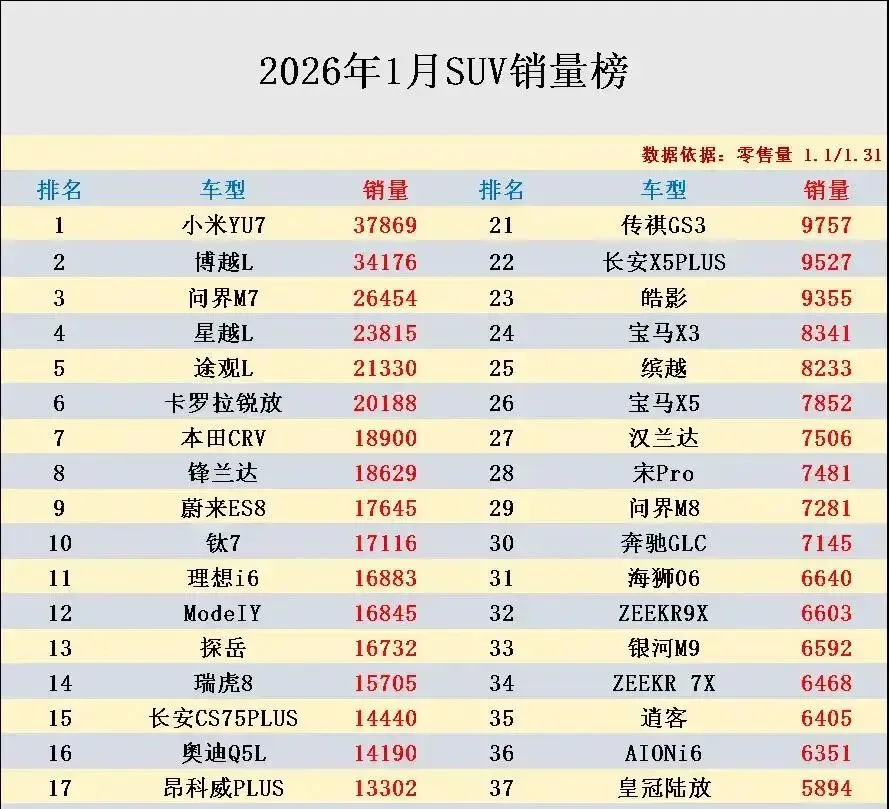 咱不整虚的,直接上干货。2026年1月SUV销量榜刚出炉,小米YU7冲上榜首,销量17116辆,直接把一众对手甩出十条街。问界M7、星越L、锋兰达也杀进前十——问界M7第2,星越L第4,锋兰达第8。而曾经的“顶流”特斯拉Model Y、理想i6,这次连前十的边都没摸着,尴尬得想钻地缝。更狠的是,宋Pro、海狮06直接跌出前二十,榜单上都快找不着影儿了。