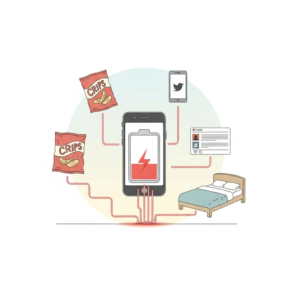 早上克制自己别赖床,掉电;中午克制自己别吃甜食,又掉电;晚上克制自己别刷手机,继续掉电。