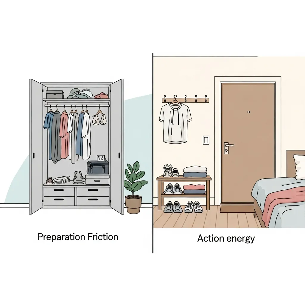 第二天早上起床,看到运动服,直接换上;出门前看到鞋,直接穿上。