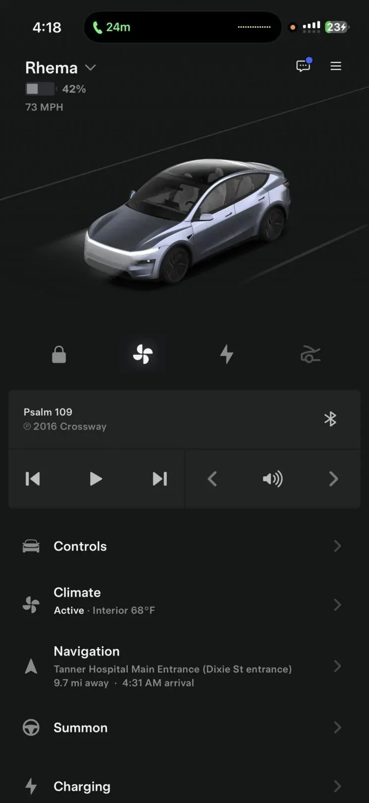 杰克代替因心肌梗塞无法开车的父亲,通过特斯拉APP变更路线的画面。 车辆以时速73英里的速度行驶,导航目的地变更为"Tanner Hospital Main Entrance" 推特截图