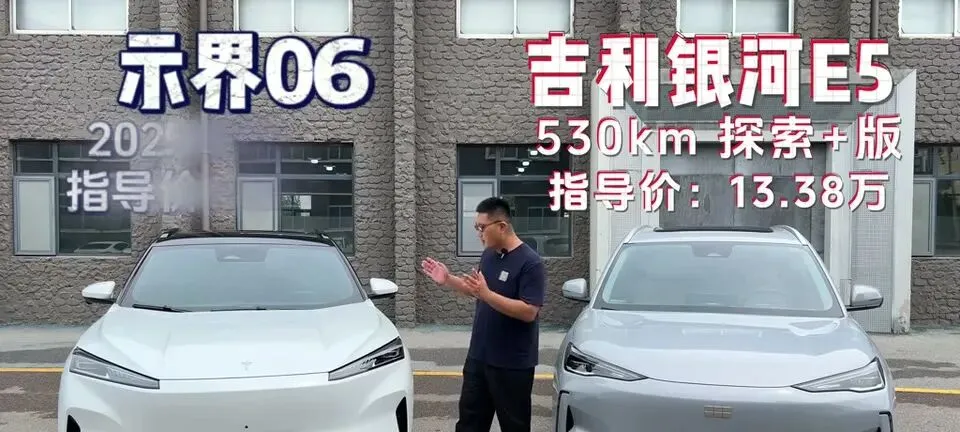 两款车型对比很直接:吉利银河E5的530km探索+版,指导价13.38万;示界06,2025款520km,指导价12.58万。