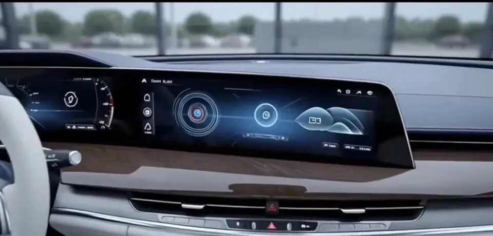 前方是一体式的高清OLED曲面屏,并且是那种横贯整个中控台的做法——原文说得很实在:“将仪表盘,娱乐与车辆控制完美整合。”