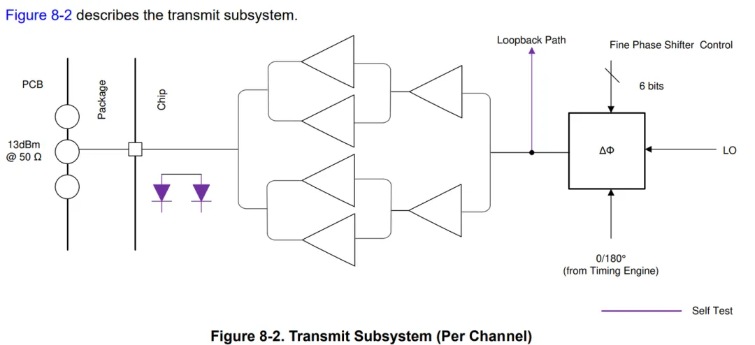 图2 发射子系统AWR2243 发射子系统由三个并行发射链组成,每个发射链均具有独立的相位和幅度控制。这三个发射链可以同时使用,也可以以时分复用的方式使用。该器件支持二进制相位调制,用于 MIMO 雷达和干扰抑制。对于 AWR2243,额外的移相器与发射通道关联,并且可以根据每个线性调频信号进行编程。每个发射链可在 PCB 上的天线端口提供最大 13 dBm 的功率。发射链还支持可编程退避,以优化系统。