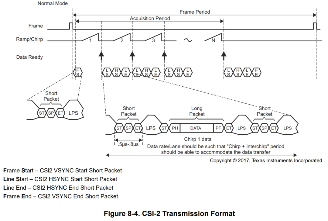 AWR2243 设备使用基于 MIPI D-PHY / CSI2 的格式将原始 ADC 样本传输到外部 MCU。如下图所示。