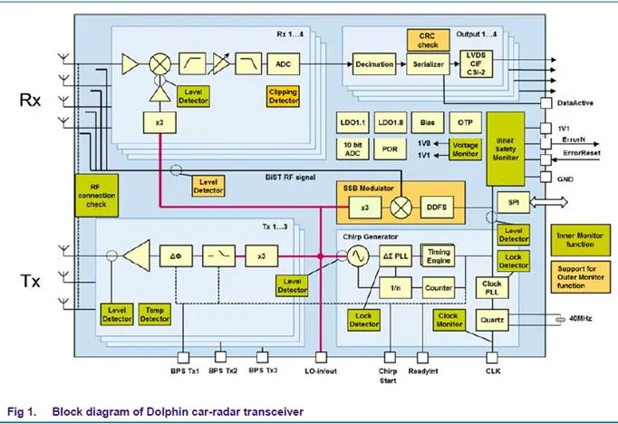 图7 NXP Dolphin Radar TransceiverNXP的MMIC芯片整体架构和TI的类似,如上图所示。