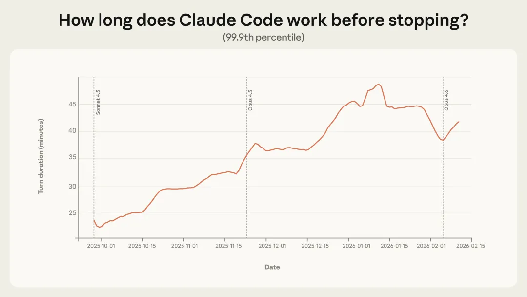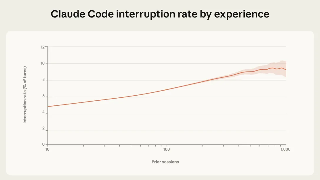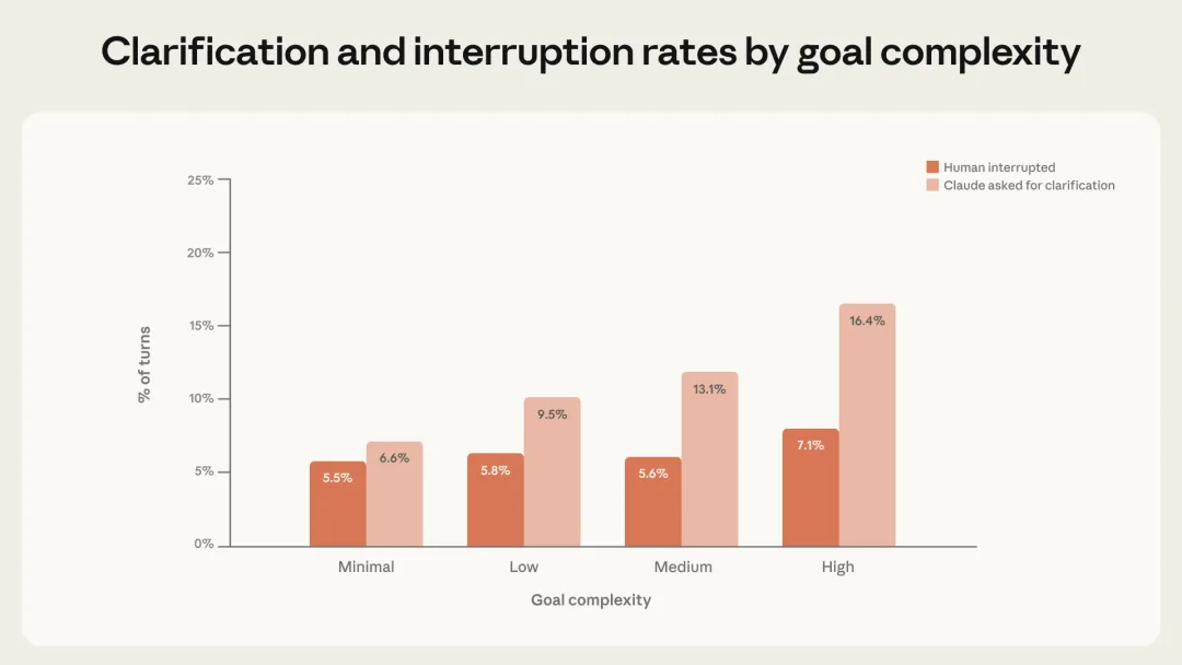假如你让AI帮你写代码、改bug,你敢让它完全自主运行多久?Anthropic发现,在实际使用中,Claude Code在最长时间的会话里,平均自主工作时间已经从25分钟增长到45分钟。而且,这还不是因为模型变聪明了——这个增长是渐进式的,不是跳跃式的。说明什么?说明AI的能力其实早就够用了,是我们还不敢完全放手。📊 有意思的数据