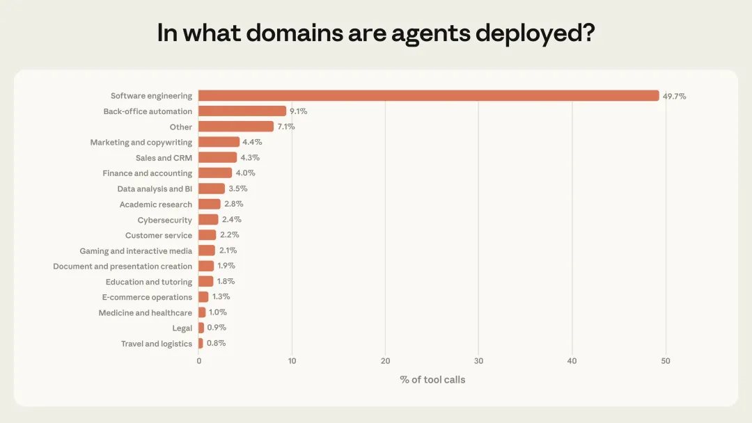 Anthropic分析了Claude Code和公共API上的数百万次交互,发现了几个反直觉的模式:新手用户(<50次会话):只有20%的时候会让AI全自动干活老用户(750次会话):超过40%的时候会让AI全自动但有意思的是——老用户中断AI的频率也更高(从5%涨到9%)。2️⃣ AI自己"踩刹车"的次数,比人类让它停下来还多在最复杂的任务上,Claude Code主动停下来问问题的次数,是人类中途中断它的两倍多。这说明什么?训练AI识别自己的不确定性,比给它加各种限制更有效。80%的工具有某种保障措施(权限限制、人工批准等)Anthropic确实看到了一些高风险领域的尝试:目前软件工程占了近50%,但随着AI向其他领域扩展,风险和自主性都会增加。💡 几个核心洞察