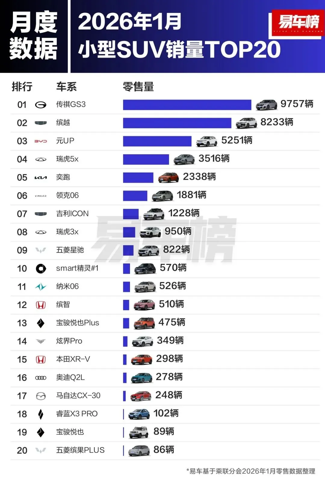 小型SUV销量前3名分别为:传祺GS3、缤越、元UP;销量分别为:9757辆、8233辆、5251辆