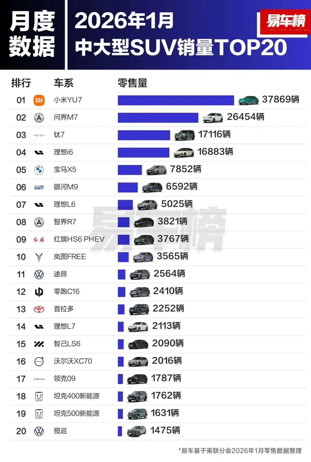 中大型SUV销量前3名分别为:小米YU7、问界M7、钛7;销量分别为:37869辆、26454辆、17116辆