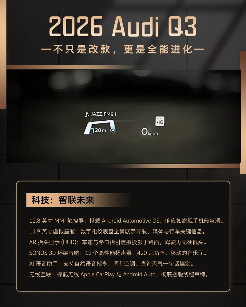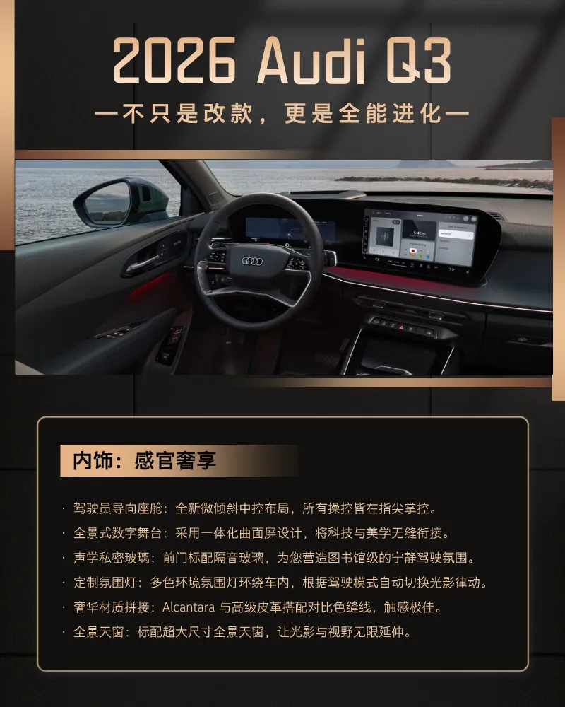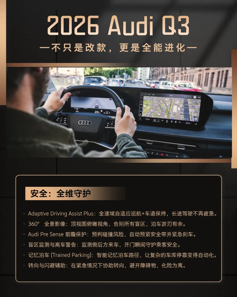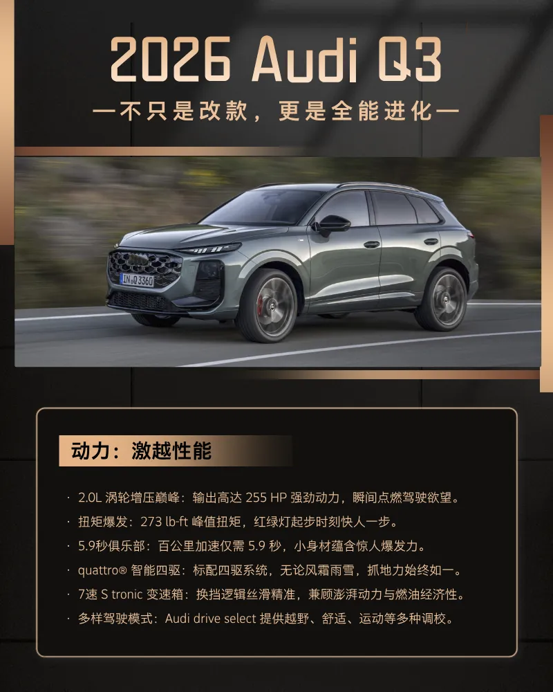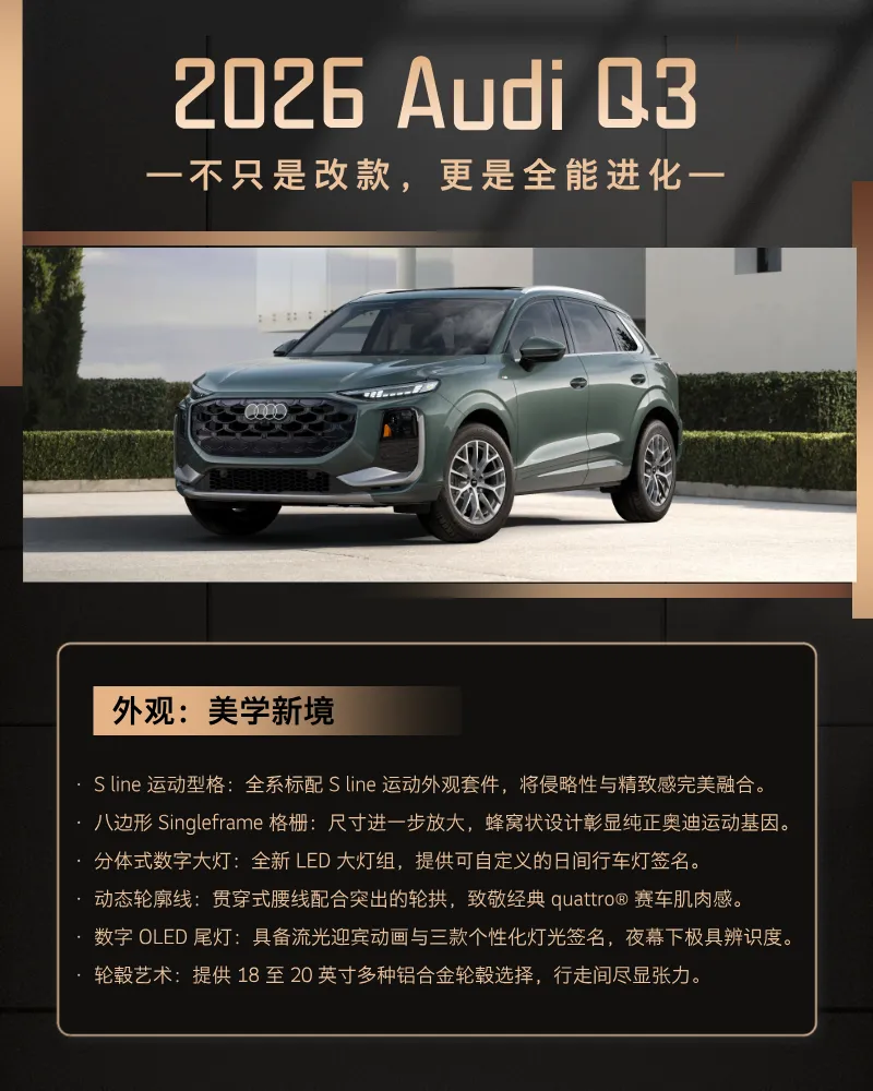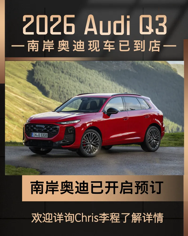 进取,永不止步。2026款 Audi Q3 现已耀目登场。马上到店预订,开启你的 quattro 之旅。