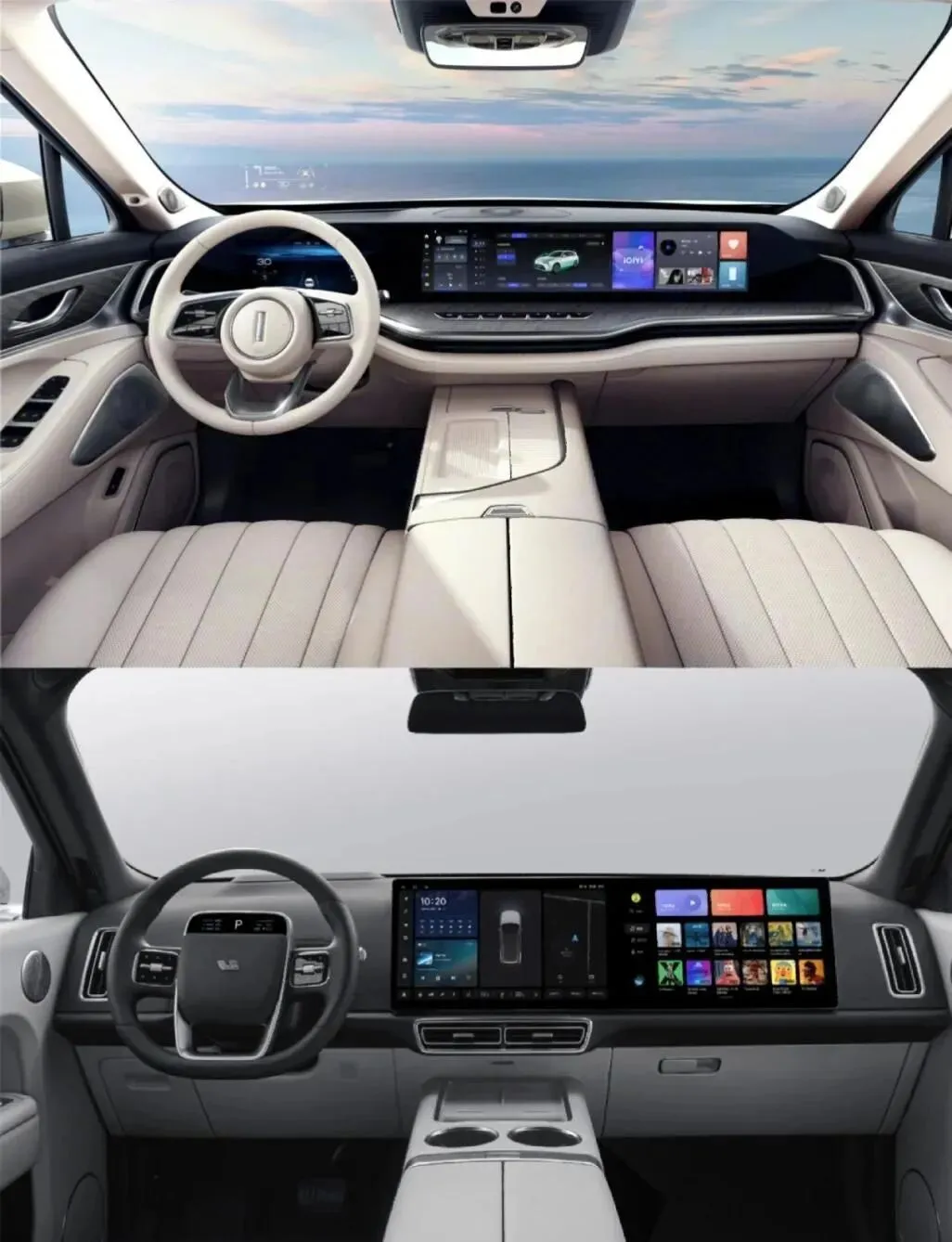 接着坐进车里.我.简.单说一下感受。内.饰是那种豪华居.家.的风格,中控是大屏+液晶仪表的组合,操.作逻辑跟我之前在蓝山上试过的差不多,流畅度不错,延迟很低。我用指甲敲了敲.中控.的饰板,是.软包的,不是那种空壳的塑料,摸着还是有点质感。方向盘是新的.样式,握感也不错,就.是有点圆润,我个人.更喜欢.稍微平点的底。座椅质.感.很好,皮料是偏硬中间带支撑的那种,坐久.了也不会塌。第二排是两个独立座.椅,宽得离谱,腿托电动可.调,我180身高腿.还能伸直一点,非常非常充裕的空间。唯一的小槽.点是中央通道有点高,第三排上去.得高抬腿,不过.空间也是.够用的。