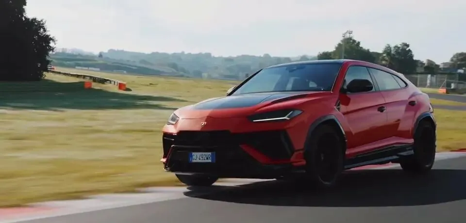 红色兰博基尼Urus在赛道上行驶