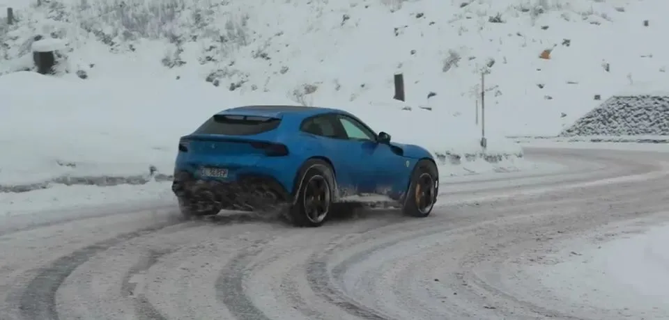 蓝色法拉利Purosangue在雪地道路上行驶
