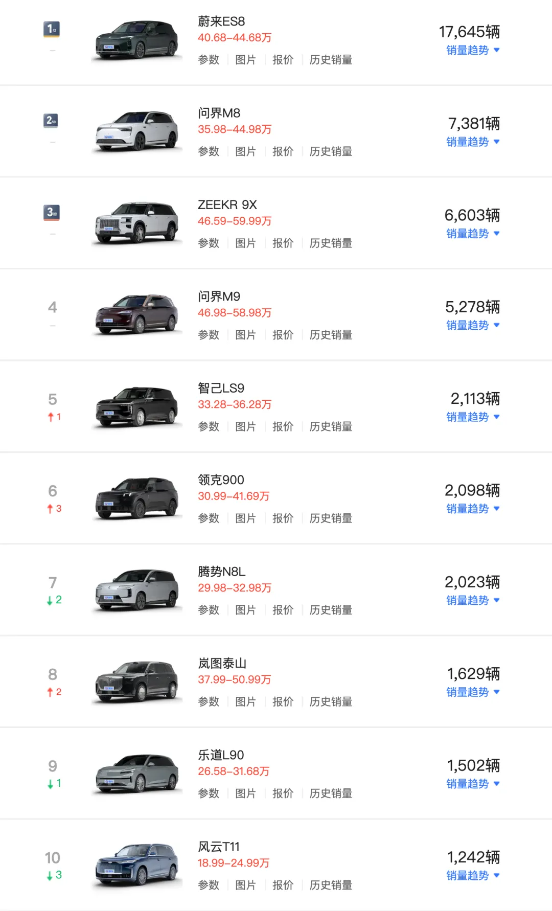 其它车型方面,均低于5000辆,其中智己LS9为2113辆(排名第五),领克900为2098辆(排名第六),腾势N8L为2023辆(排名第七),岚图泰山为1629辆(排名第八),乐道L90为1502辆(排名第九),风云T11为1242辆(排名第十)。
