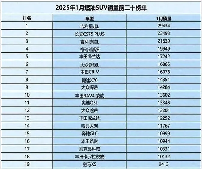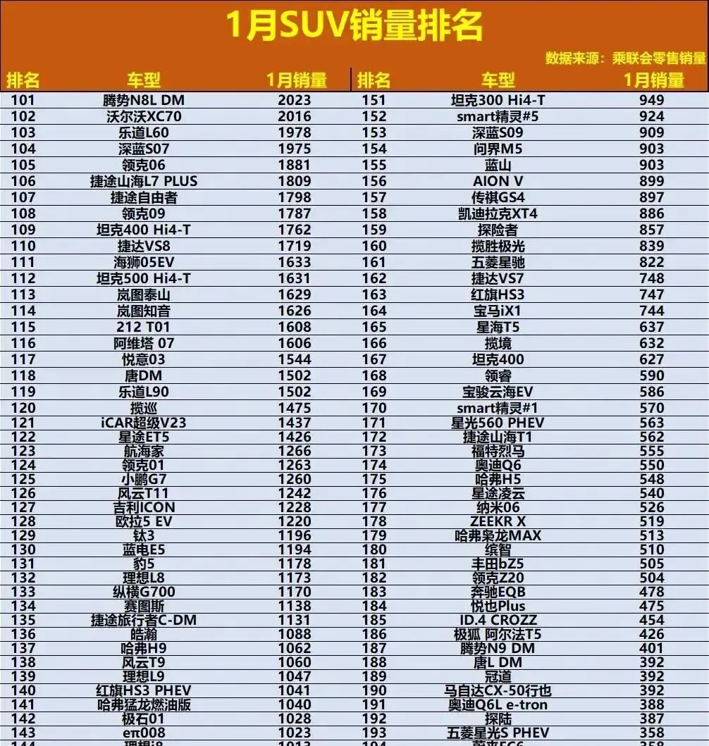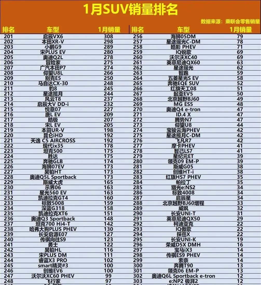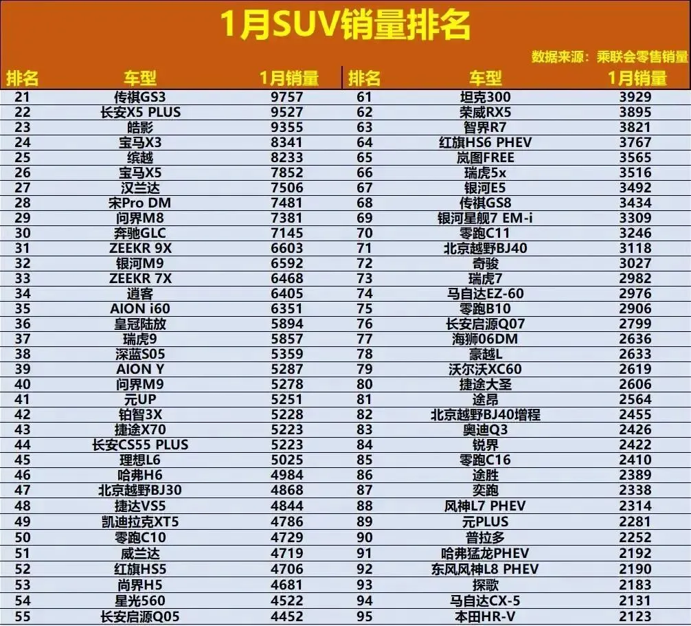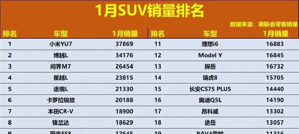 # 1月SUV销量炸了!合资车集体失联,CR-V跌到第7,小米YU7狂卖3.7万!