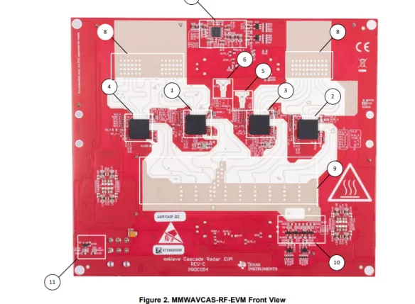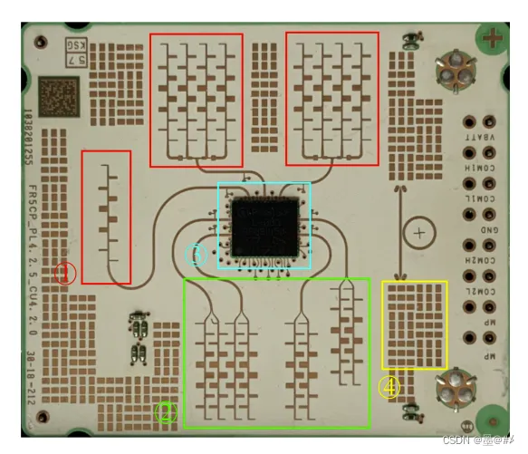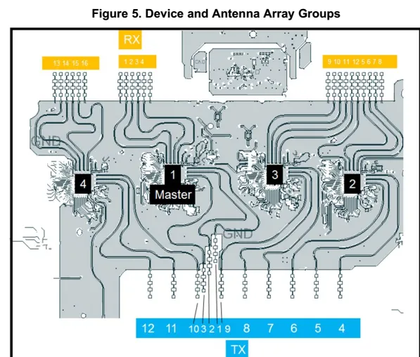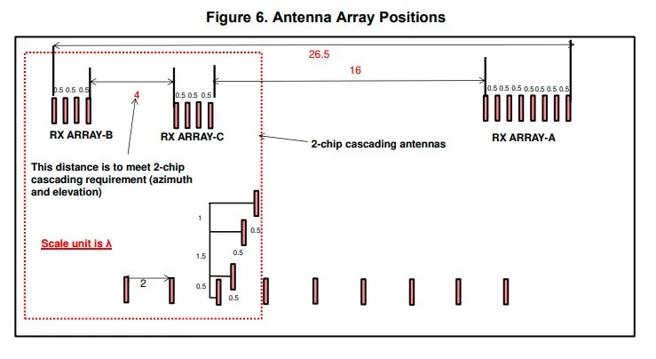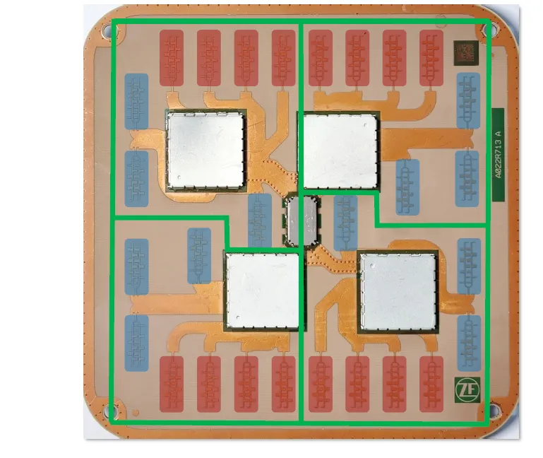 下图中的绿色线框有助于组织天线所属的MMIC,蓝色为发射天线,红色为接收天线。
