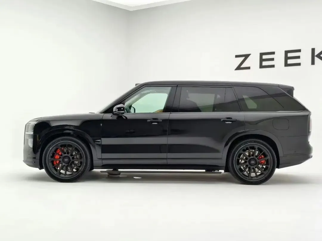 先说.外观,这车第一眼看过去确实有那.种旗舰的气场,长度五米二,轴距三米.一多,比例特别顺眼。前脸用.了极氪家族.那套分体灯设计,灯腔挺深,然后中间那个贯穿灯我晚.上拍给你们看一下,点亮之后挺有辨识度。整台车的姿态是.那种低趴宽体的感.觉,不是那种笨重的.中大型SUV。我.绕.到.侧面看,腰线干净利落,尤.其是那四个21寸的轮毂,造型像是“风火轮”,挺战斗。尾部.就比较饱.满,有.点XC90那种稳重感。