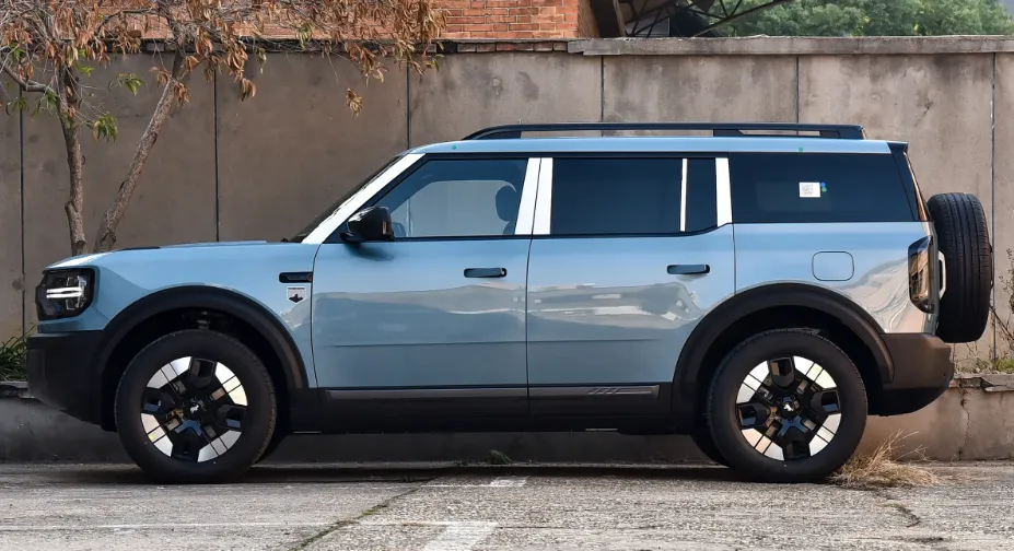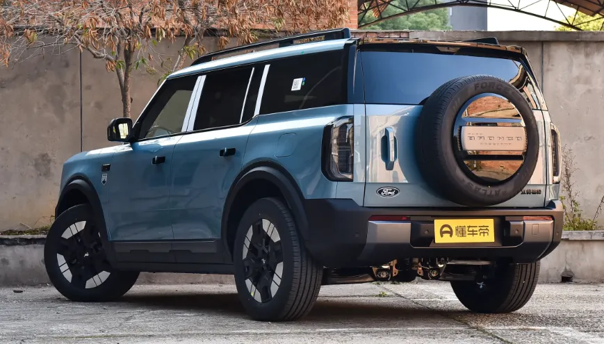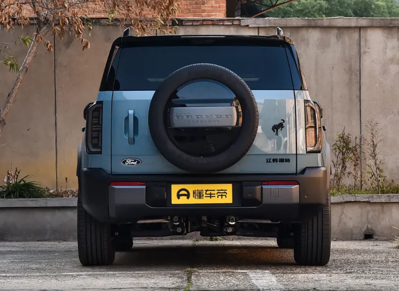 首先说外观吧,这个车它保留了烈马家族那个硬朗的线条,就是一看就知道是福特烈马对吧,然后它这个前脸是封闭式的,车标LOGO还会发光,我觉得这个设计挺有科技感的。侧面的话它用了熏黑的车柱,然后营造出一个悬浮式车顶的感觉,轮拱那边也有那个凌厉的筋线,看起来就特别有力量感。车尾还是那个侧开式尾门,然后外挂备胎,这个是烈马的标志性设计嘛,但是整体感觉就是,它没有那么粗犷了,就是在城市里开也不会很突兀那种。