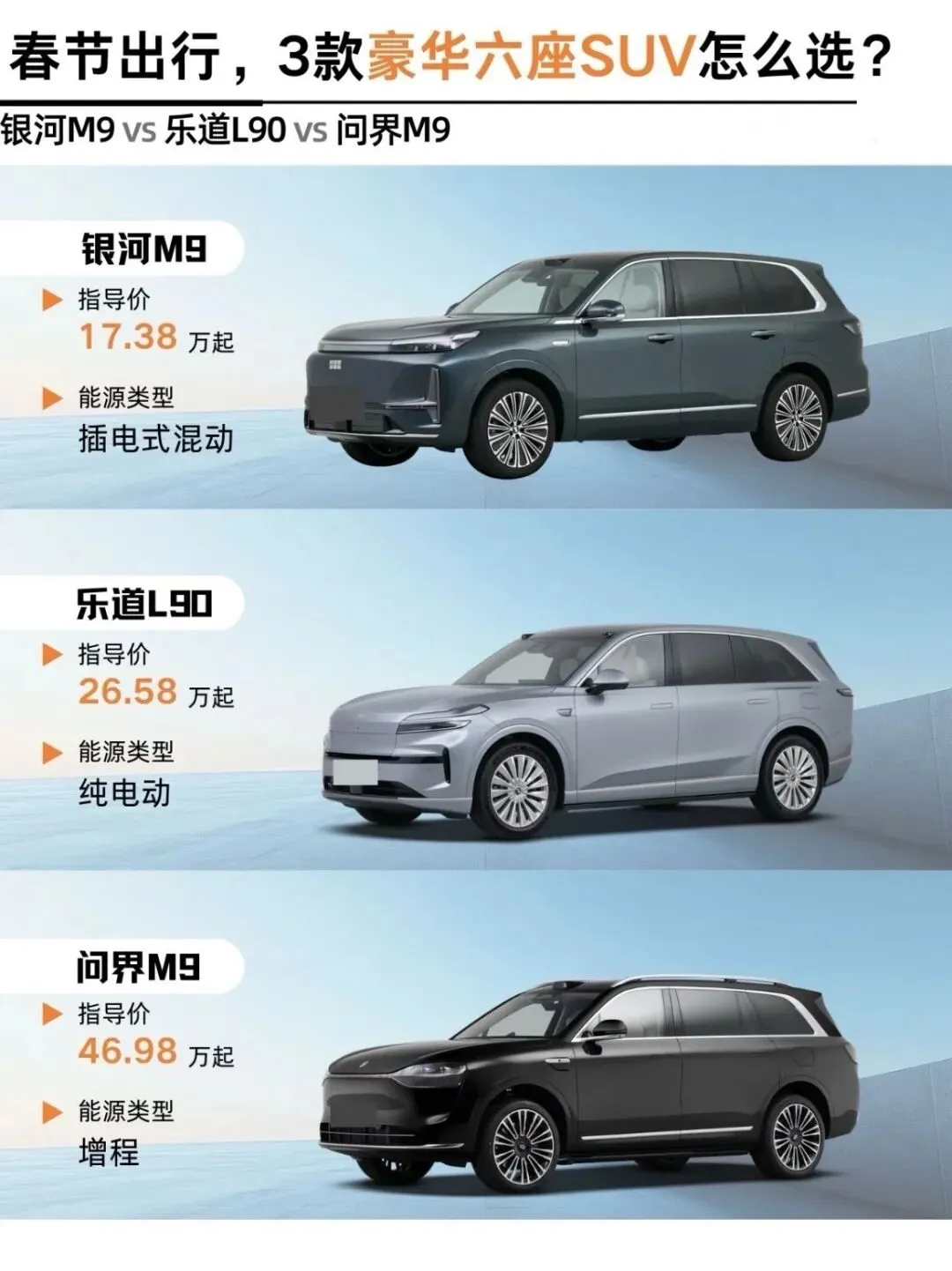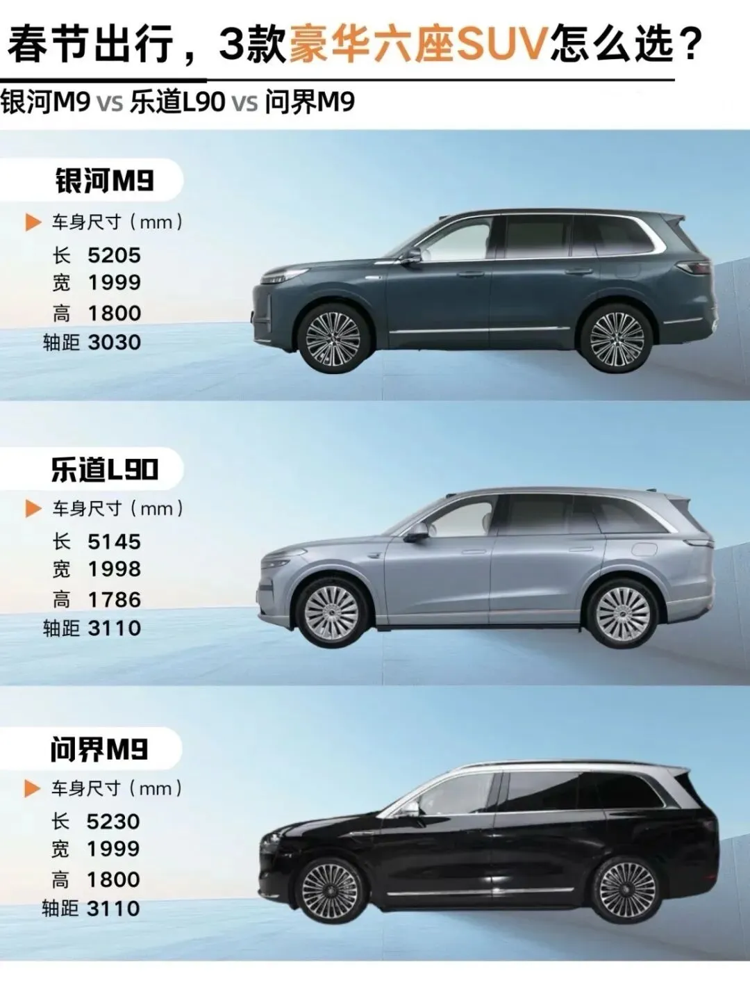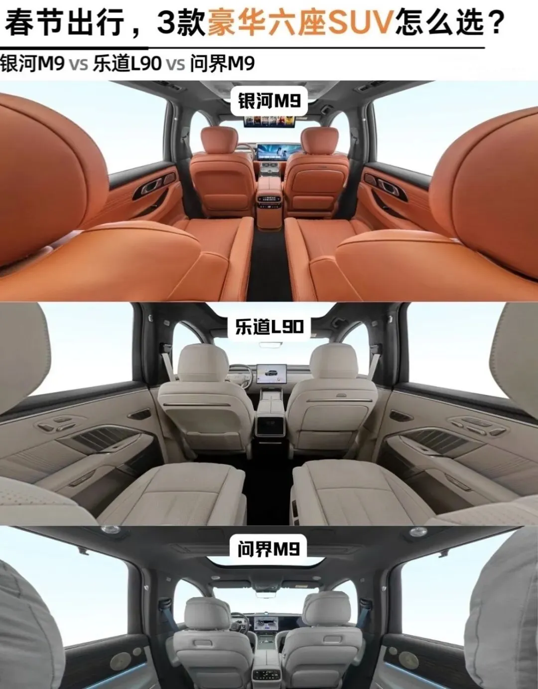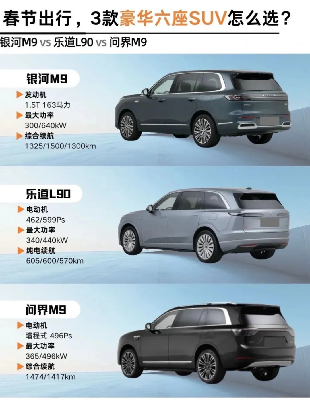 春节假期很多车主都喜欢自驾游吧,选取了3款热门的六座SUV—银河M9、乐道L90、问界 M9,通过多维度硬核对比,帮你精准选车!其中银河M9兼顾性价比、空间、舒适与智能,春节出行既体面又很实用,这3款豪华型大六座SUV,你更pick谁呢?