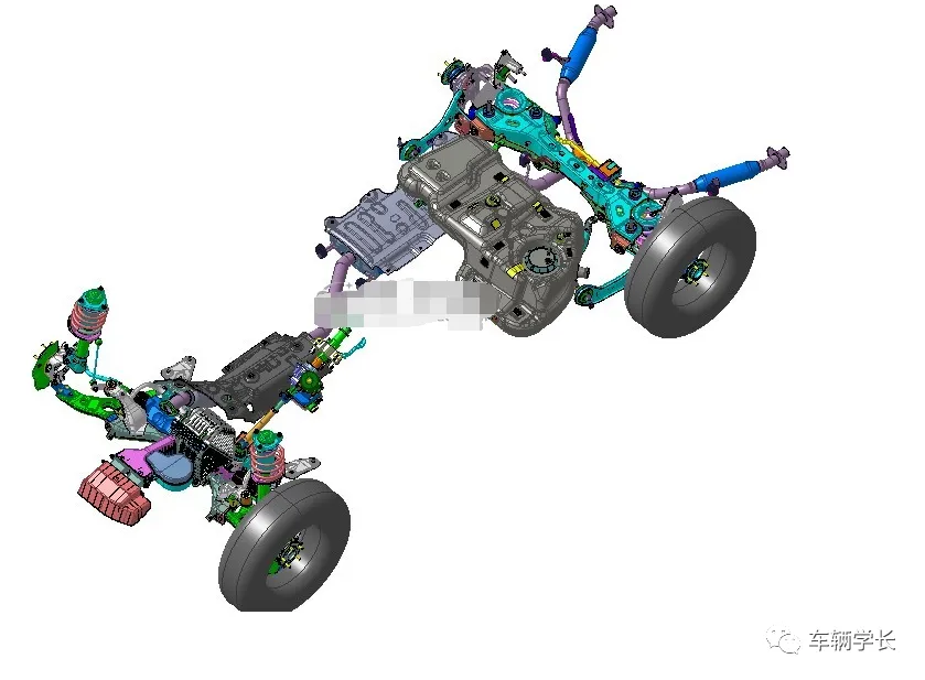 该 SUV 采用横置前驱平台的承载式车身核心结构,通过 CATIA 模型的截面视图可见,车身地板采用阶梯式纵梁布局,在保证扭转刚度的前提下优化后排腿部空间。底盘系统采用麦弗逊前悬架 + 多连杆后悬架的组合方案,前悬架的一体化副车架集成了转向机与发动机悬置,有效降低NVH 振动传递效率;后悬架的H 型纵臂结构兼顾承载能力与侧向支撑,配合可变阻尼减振器,实现家用舒适性与户外操控性的平衡。设计中通过拓扑优化缩减了前机舱非受力结构,整车自重较上一代降低约 6%,同时满足 C-NCAP 五星碰撞标准。