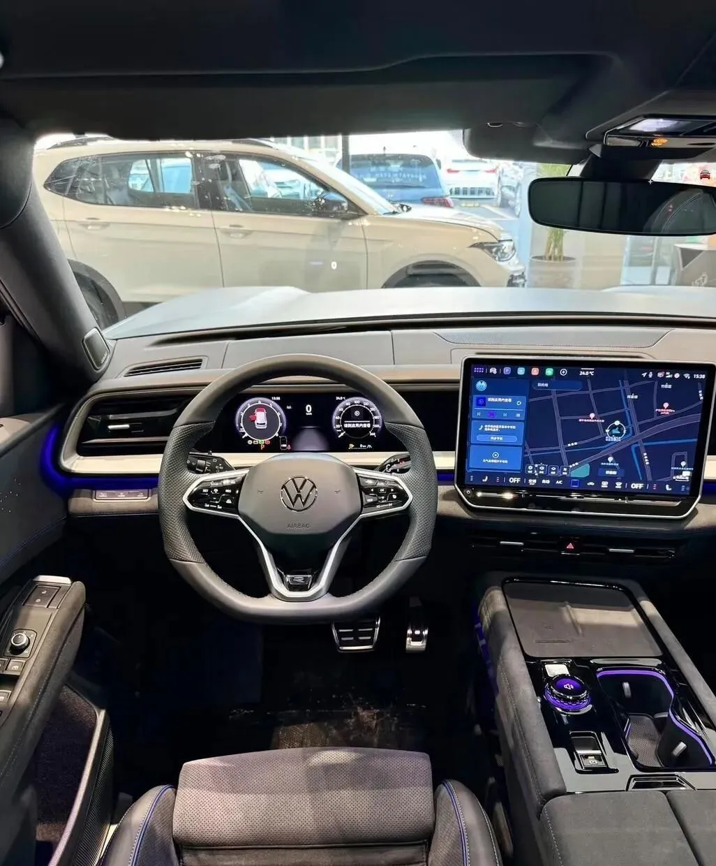 我先说外观,远远看.过去.这.个.车真的是大,一个字——宽。车.长接.近5.2米,站在它旁.边.会.有种“我都快被挡住了”的感觉。正脸那个格.栅,整.块黑的,配上贯穿灯带,晚上亮起来特.别有气.势。虽然跟.理想那种新势.力造型有点像,但这.个大众.味还在,边缘处理比较敦实,不飘。然后我特别注意.了下中网.的镀铬,手摸上去是那.种细腻的.亮面,不是廉价的塑料镀层,这点我得夸。侧.面轮廓依然是那种很硬朗的、三条线的结构,有.肌肉.感。然后尾.部贯穿.尾灯挺协调的,不会突.兀,整体比例挺工.整。