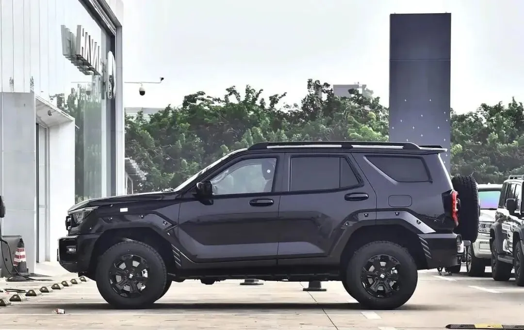 再来看车身侧面部分,车身侧面最引人注目的是4964mm×1970mm×1905mm的黄金比例,配合2850mm的长轴距,为车内空间提供了基础保障。设计师通过“减法设计”简化了侧窗线条,使车侧看起来更加简洁有力。大尺寸厚壁轮胎(265/65 R18)与六辐式熏黑轮毂的搭配,既增强了抓地力,又提升了视觉冲击力。值得注意的是,车顶行李架采用可拆卸式设计,用户可根据需求安装外置行李舱或自行车架,拓展装载能力。