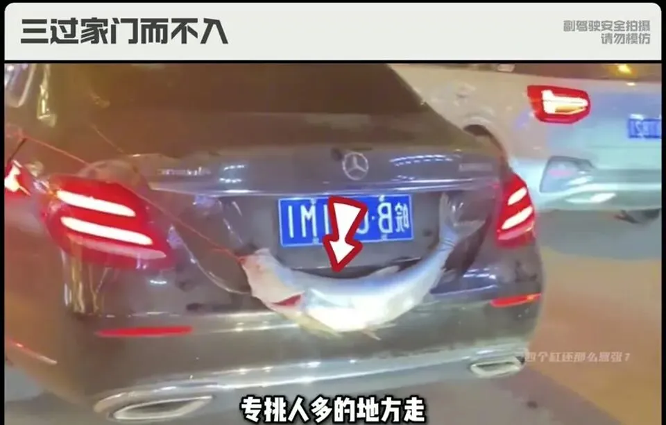 黑色奔驰轿车后备箱挂着一条大鱼