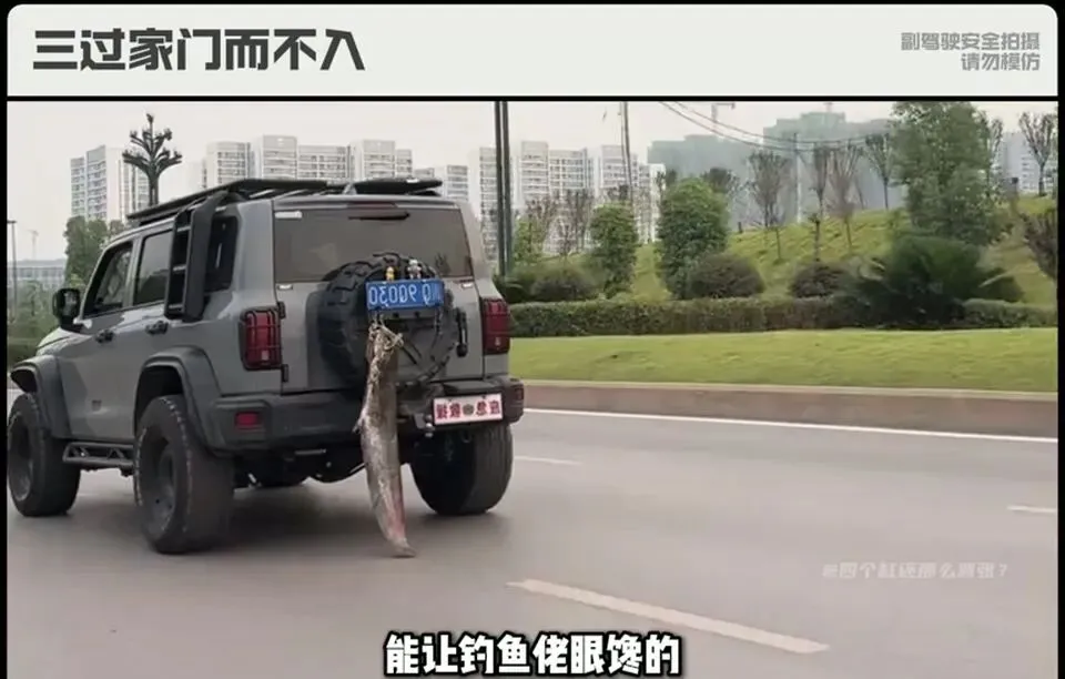 灰色SUV后备轮胎上挂着一条大鱼