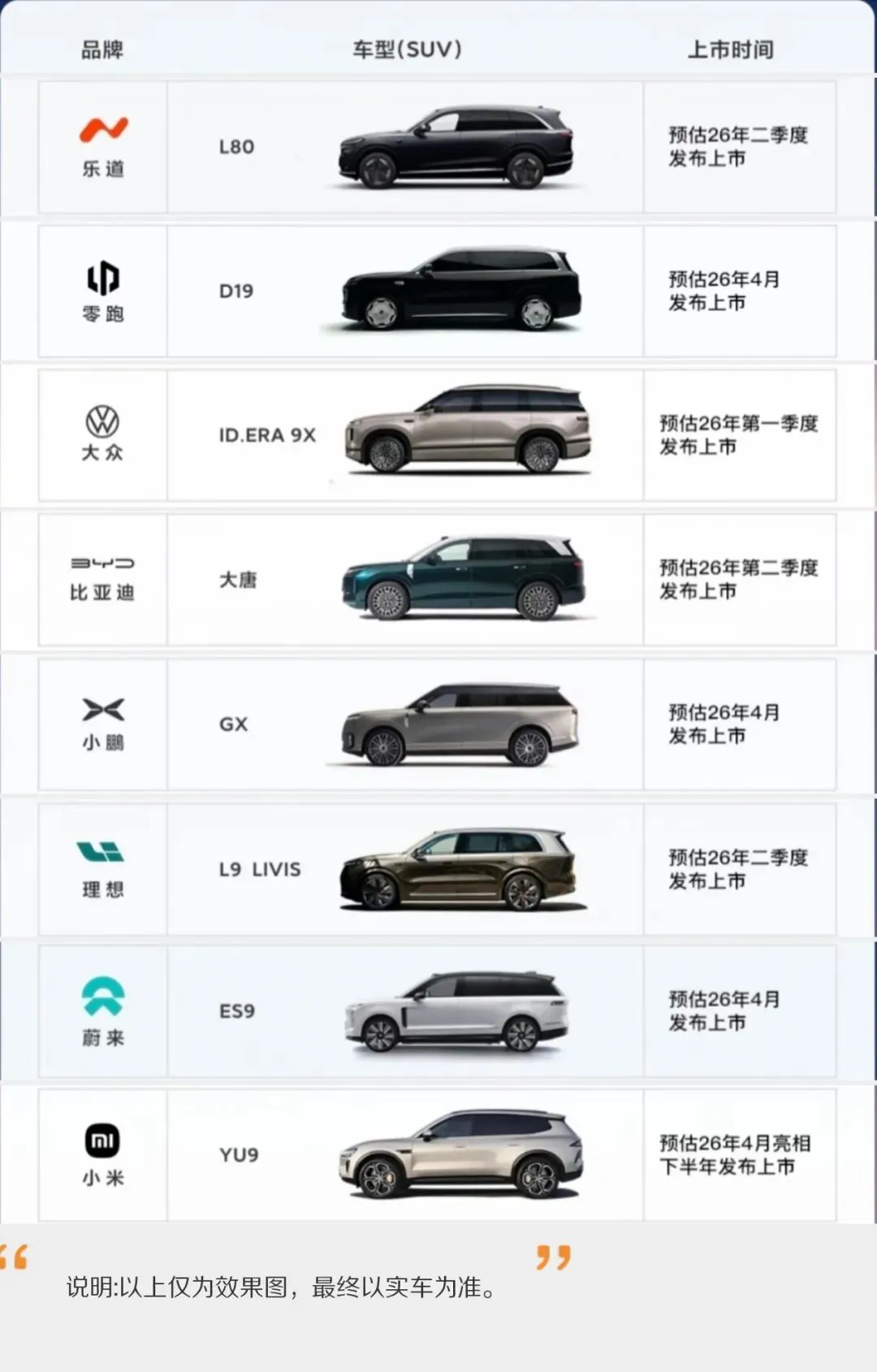 今天跟大家来梳理一下2026年即将上市的八款热门SUV车型,及预计的上市时间,涵盖了乐道L80、零跑D19、大众ID.ERA 9X、比亚迪大唐、小鹏GX、理想L9 LIVIS、蔚来ES9和小米YU9等车型,为大家在新的一年购车提供一个选择参考方向。