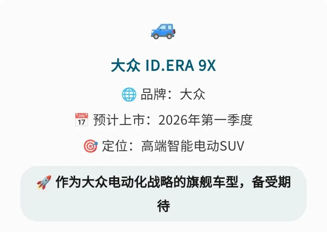 在2026年的第一季度,大众汽车将率先推出其全新电动SUV——ID.ERA 9X。作为大众ID.系列的最新力作,这款车型预计将搭载最新的MEB+平台,主打智能化与豪华感,旨在与新势力品牌在高端市场展开直接竞争。