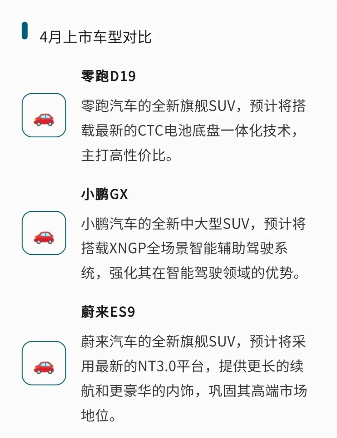 2026年4月将是SUV市场最热闹的月份之一,零跑D19、小鹏GX、蔚来ES9三款新势力车型将同期发布上市。这标志着新势力品牌在产品布局上已从“单点突破”进入“全面开花”的新阶段,竞争将从单一车型扩展到整个产品矩阵。