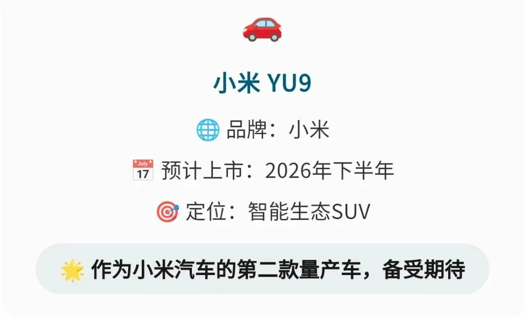 作为2026年最受关注的车型之一,小米YU9预计将在下半年正式发布上市。这款车型不仅是小米汽车的第二款量产车,更是其在智能生态领域的重要布局。小米YU9将深度整合小米的智能生态,为用户提供前所未有的智能出行体验。