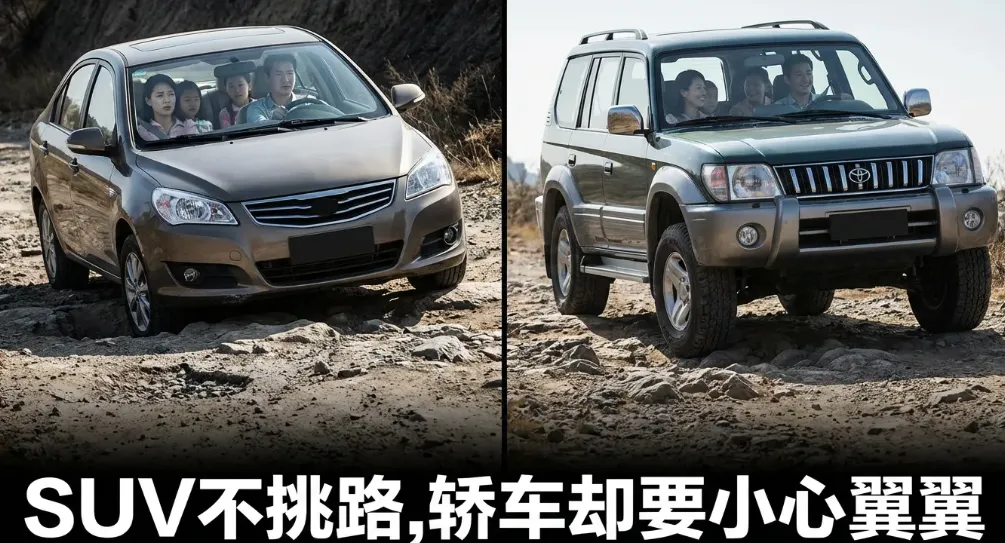 SUV 离地间隙更高(通常 200mm+),面对坑洼、减速带、积水、土路更轻松,周末露营或郊外出行适应性更强