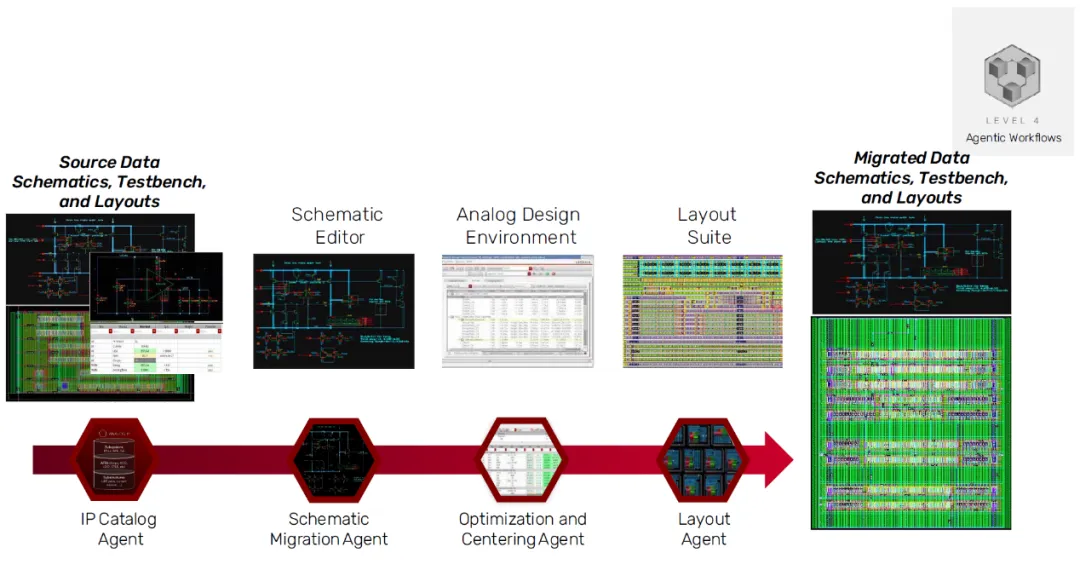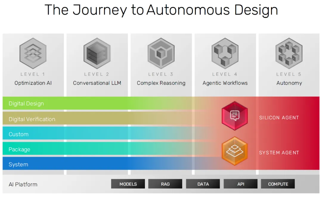 Level 4 从单任务自动化扩展至多智能体、多领域协同工作流。AI 系统通过互联代理协同完成跨设计阶段任务,实现多工具、多厂商环境中的无缝流程。