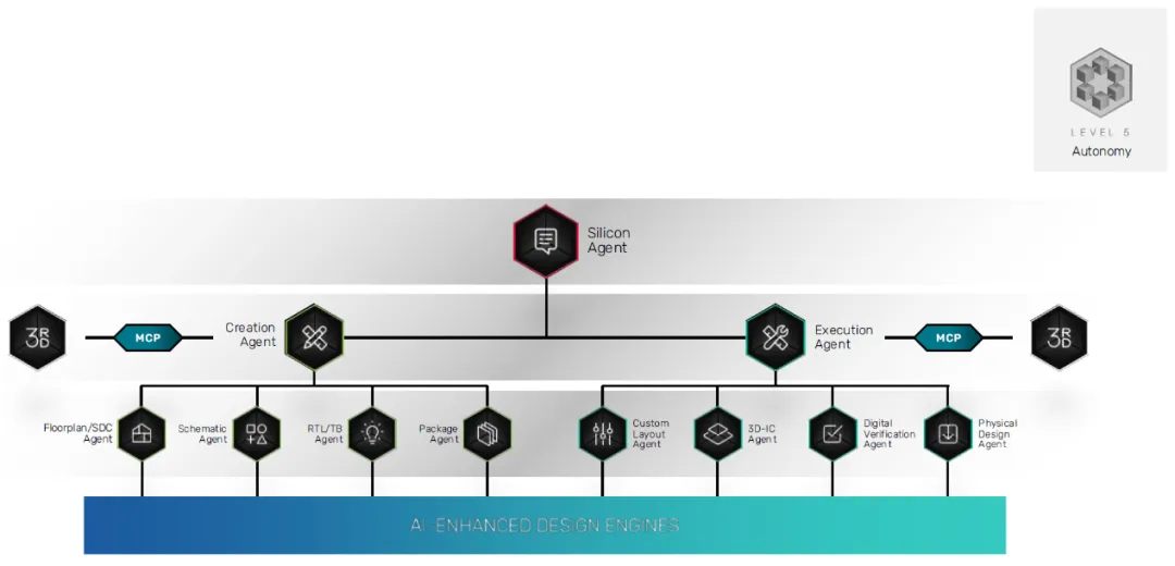 Level 5 是 AI 驱动设计自动化的最高阶段。顶层“硅代理(silicon agent)”统一管理数百个子代理,覆盖完整设计生命周期: