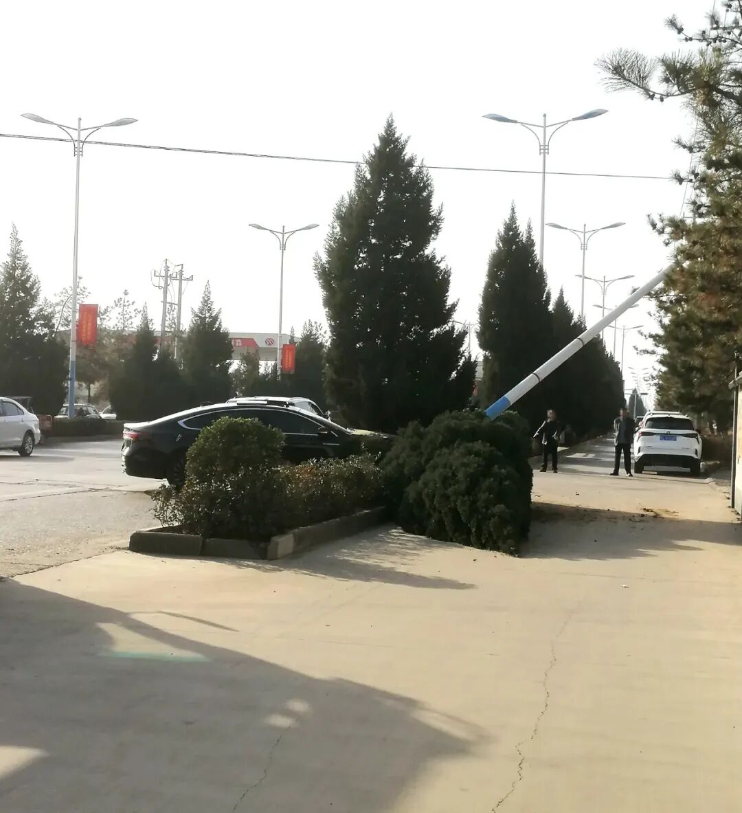 >爆料▍临汾一起事故:一黑色轿车冲入路侧绿化带,将路灯杆撞倒...